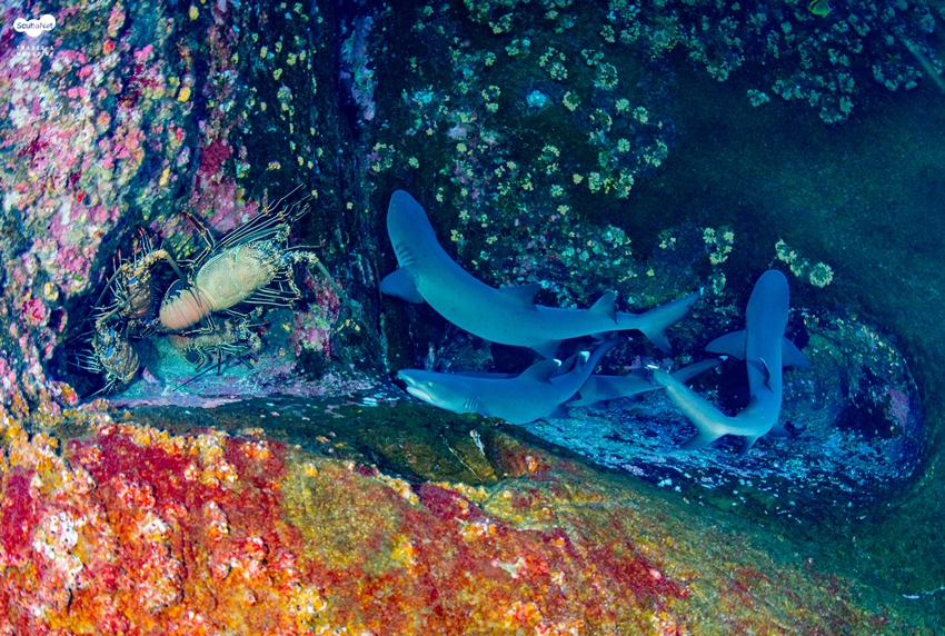 바닷가재들과 화이트팁 리프상어들이 한 곳에 자리를 잡고 있는 신기한 광경. 멕시코 소코로