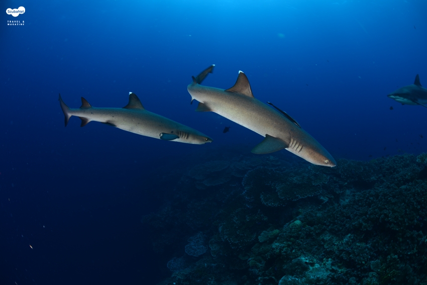 두 마리의 화이트팁 상어가 유영하며 다가왔다. 오른쪽 끝은 그레이리프상어. 파푸아뉴기니 상어 피딩 사이트.