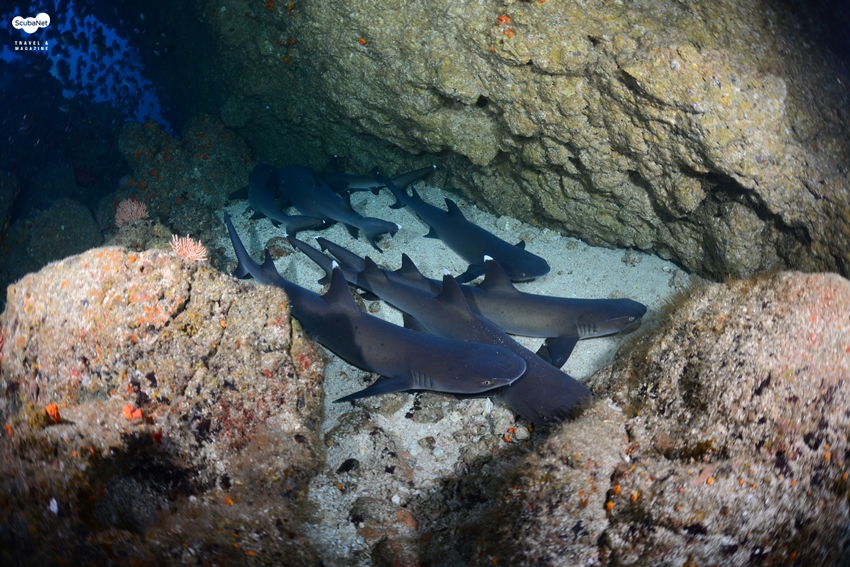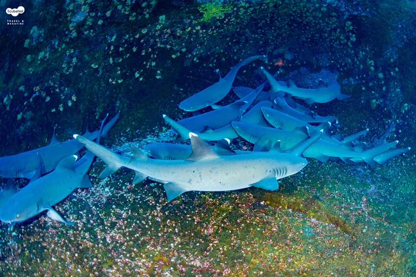멕시코 소코로 수중 절벽의 좁은 턱에 모여있는 화이트팁 리프 상어들