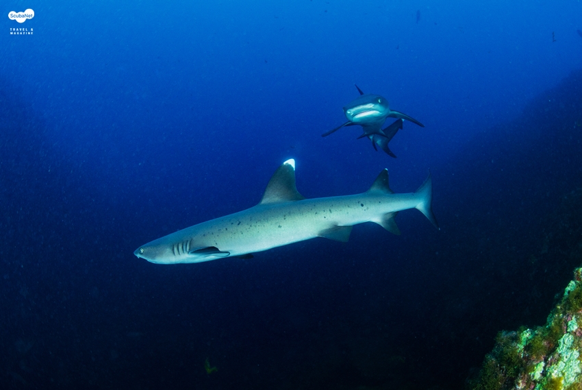 쉬고 있다가 다이버들의 방문에 놀라 유영하고 있는 화이트팁 상어들. 코스타리카 코코스.