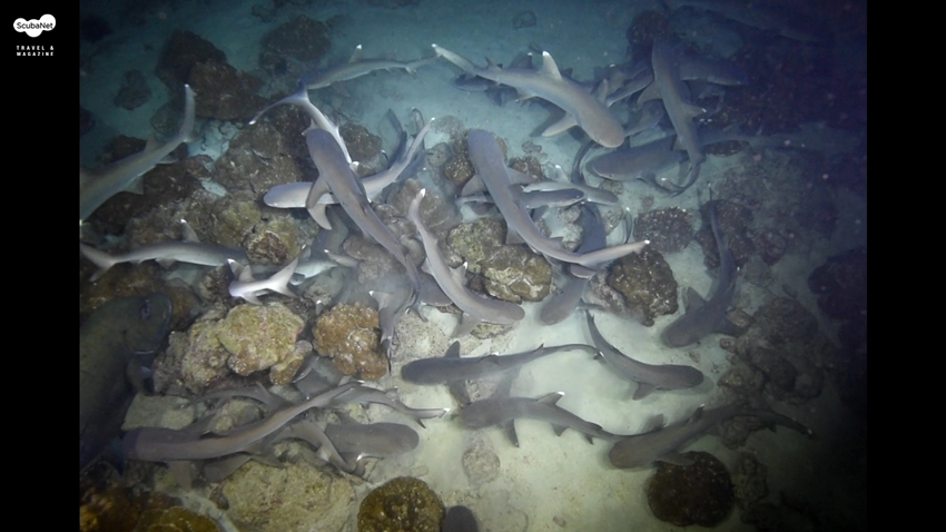 코코스 야간다이빙에서 만난 사냥 중인 화이트팁 리프 상어들. 정덕재님 동영상에서 캡쳐.