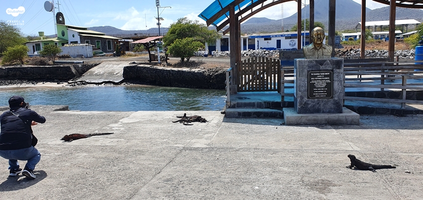 벨레스코 이바라 항의 모습. 다바이구아나들이 여기저기 흩어져서 쉬고 있다. 갈라파고스에서 태어난 최초의 인물 롤프 흉상도 보인다.