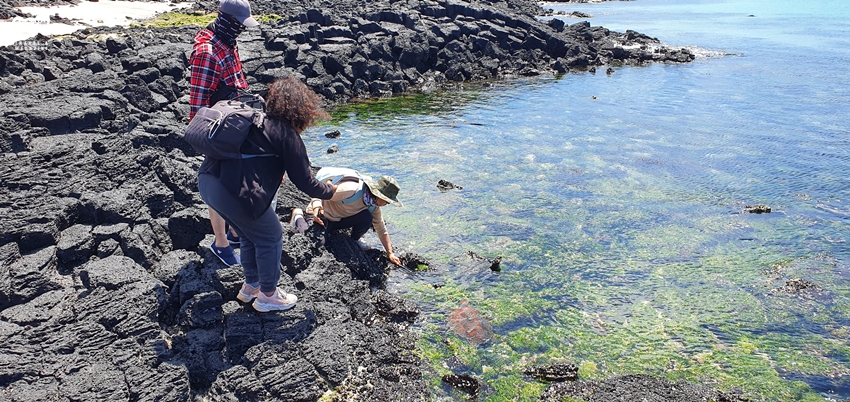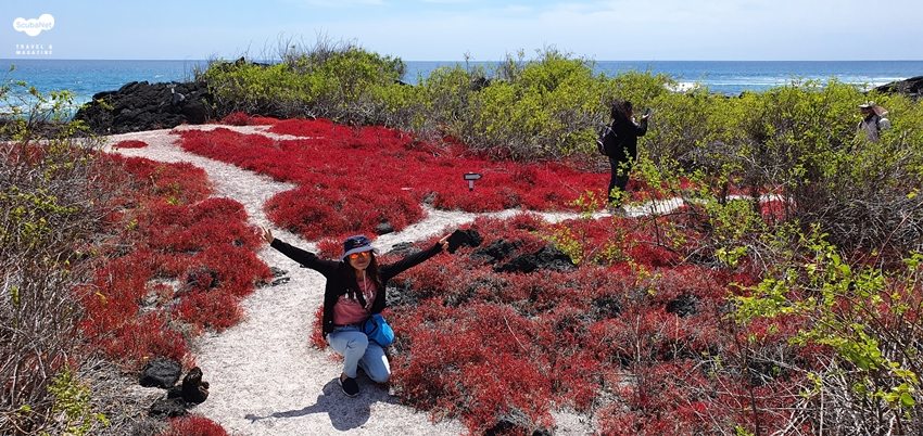 붉은 색으로 변한 갈라파고스 융단 잡초를 배경으로 사진을 촬영하는 일행들