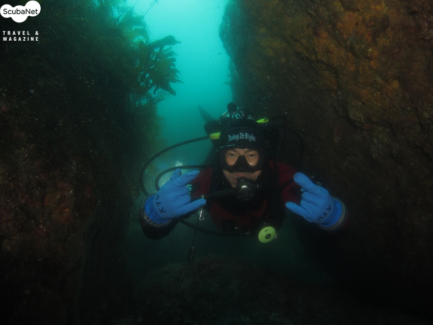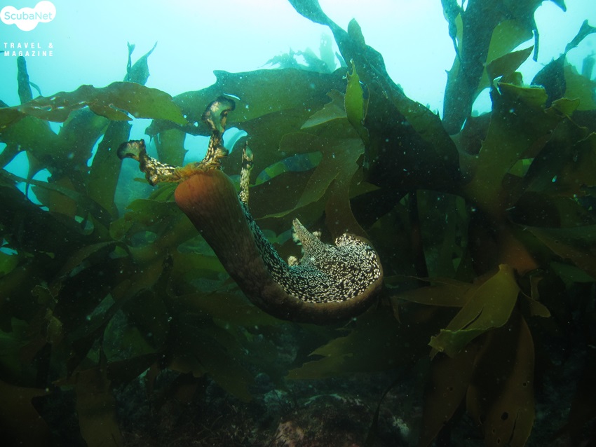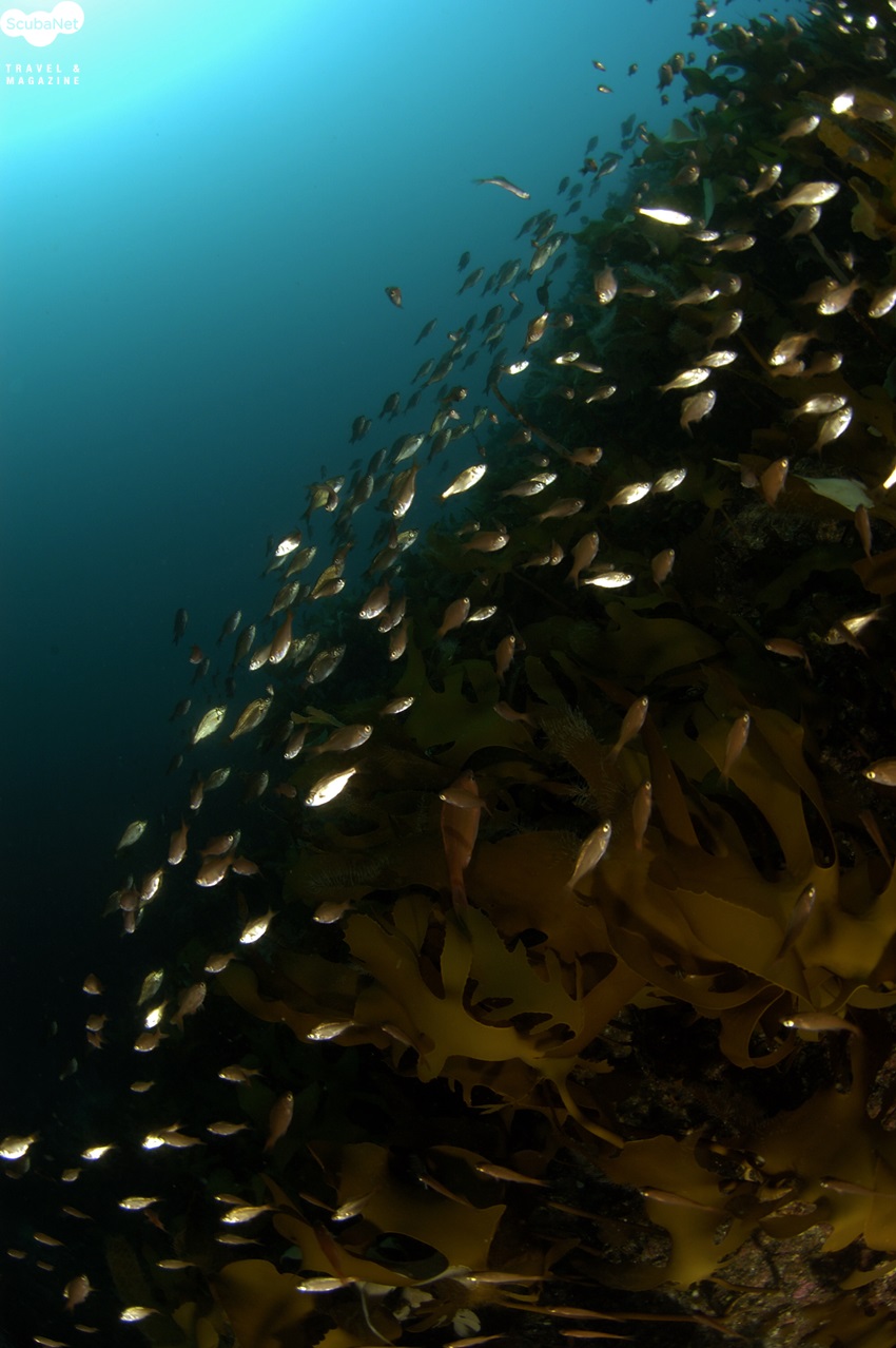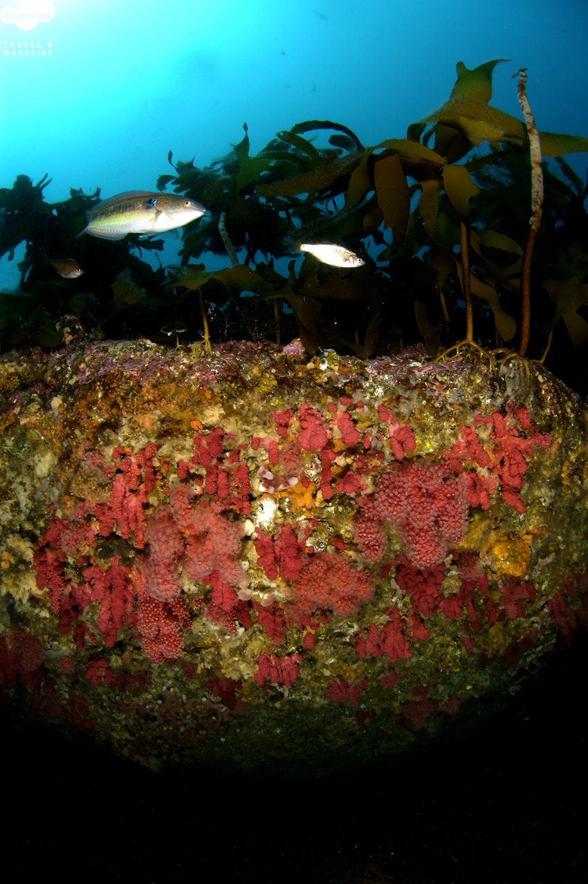 독도 수중의 감태 숲과 바위 아래의 바다딸기 군락