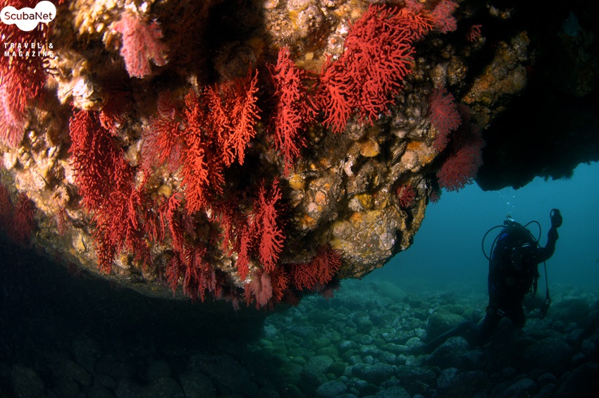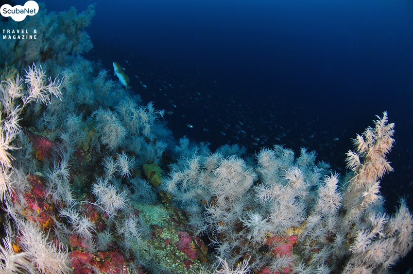독도의 수중동굴 천장에 군락을 이룬 부채뿔산호들