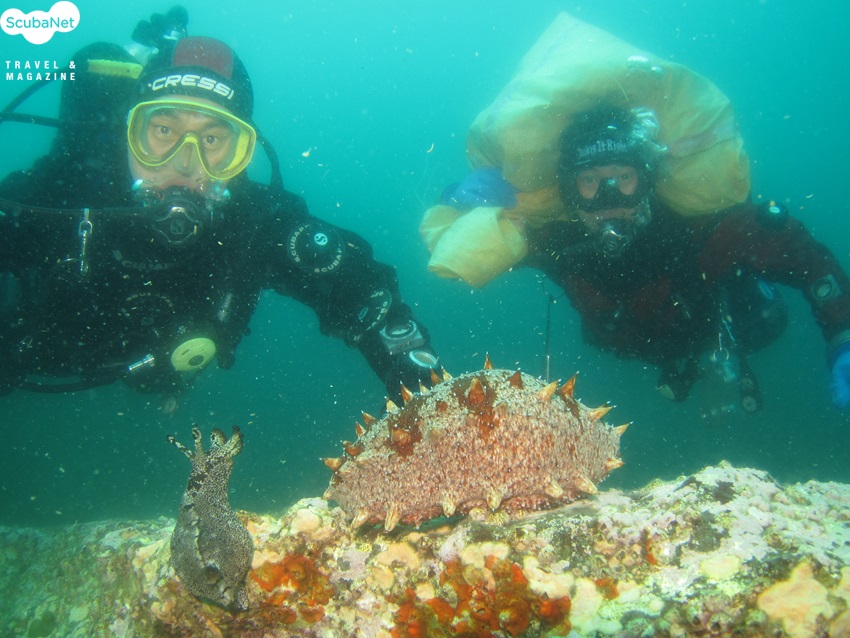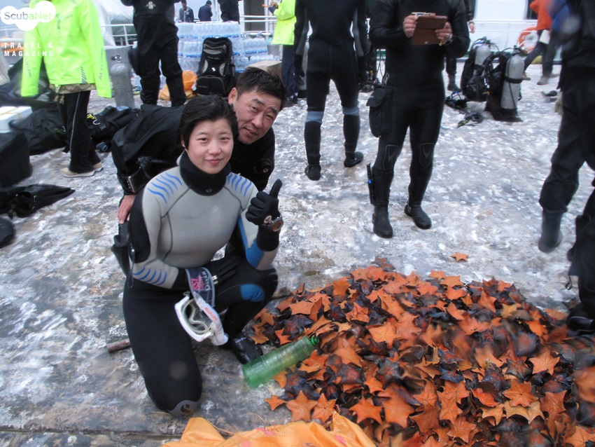 이번 독도다이빙의 주목적이 수중정화활동이었기에 30여명의 다이버들은 동도 접안시설 주변에서 해조류의 천적인 불가사리와 성게는 물론 해양쓰레기까지 수거했으며 필자는 수중에서의 정화활동을 카메라에 담아보았다. 육상에는 갈매기들이 많더니만 독도수중에는 대황 위에 자리 잡은 군소들이 상당수 관찰되었고 붉은색을 띤 홍삼들도 빠지지 않았다. 15m 이상까지 내려가도 시야는 3m 내외였고 부유물이 많아서 푸르른 독도바다의 진면목을 찾아볼 수는 없었다. 40여분의 정화활동을 마치고 올라와 수거한 것들을 한곳에 모아놓으니 그 양이 상당하였다.