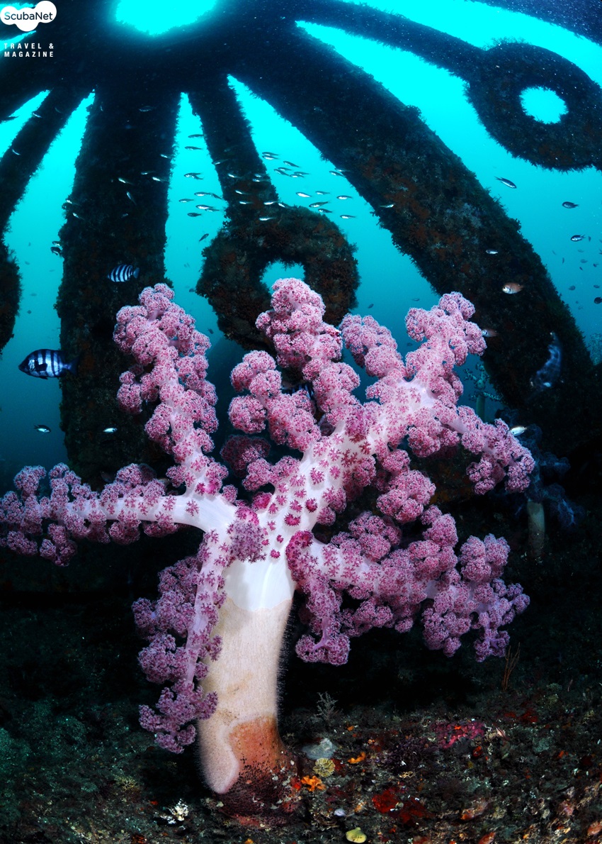 용궁수심 46m에 시설된 육각형 어초 안의 수지맨드라미 산호와 돌돔(제주 모슬포)