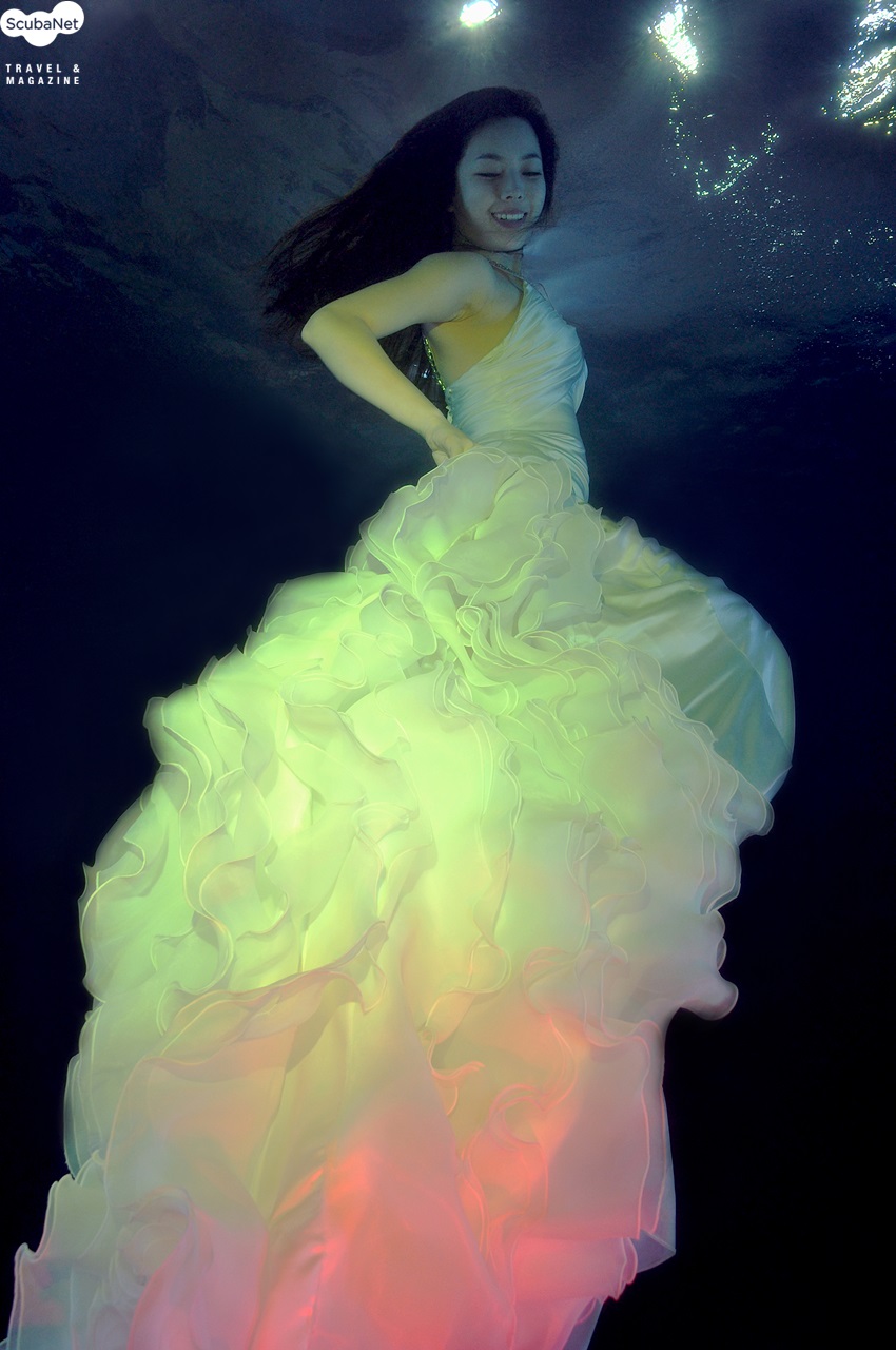 웨딩드레스 2개의 스트로브에 각각 레드와 옐로우 필터를 사용하여 순백색의 웨딩드레스를컬러풀한 이미지로 촬영