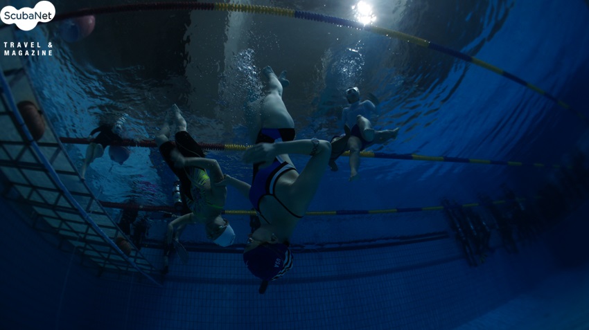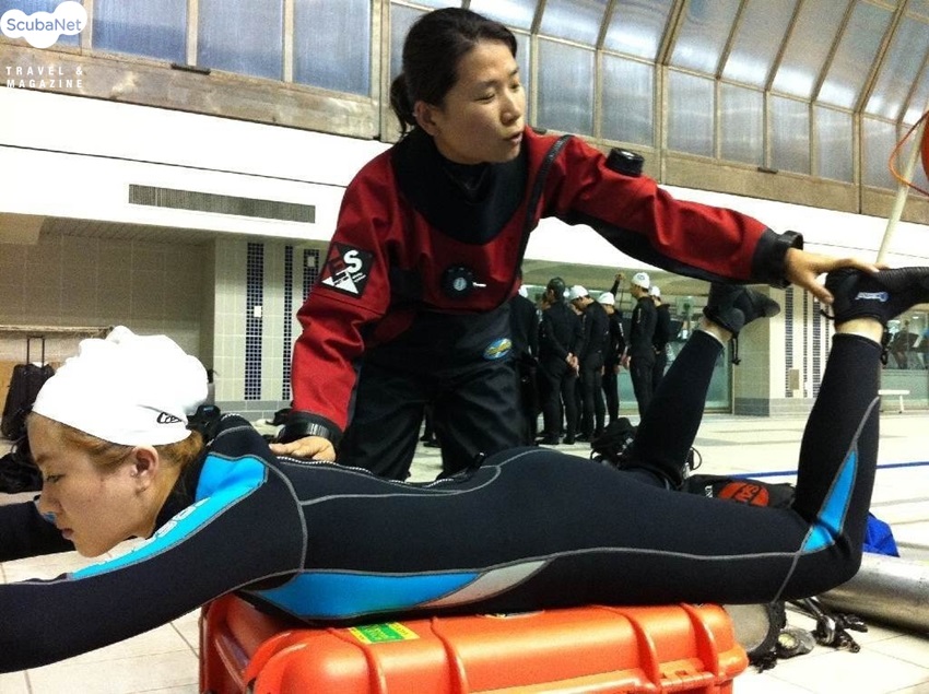 스쿠버넷 매거진 4월호에 소개되었던 정보윤 강사의 한국수중모델학교가 최근 활발한 활동으로 많은 수중 사진가들과 다이버들의 관심을 받고 있다. 수중모델학교는 교장 정보윤 강사 외에 아홉 명의 여성 스쿠버다이버가 학생으로 참여하고 있다. 한국 최고의 수중모델로 손꼽히며 이미 여러 수중촬영대회에서 탁월한 실력을 보여주었던 정보윤 강사는 말할 것도 없고 아홉 명의 학생 중에는 고개가 끄덕여질 정도로 다양한 경력을 가진 사람들이 있다. 싱크로나이즈드스위밍 선수, 모노핀 수영 선수, 텍 다이버 등 각 분야에서 손꼽히는 전문가들이다. 이런 여성 다이버들이 수중모델이 되기 위해 모인 것이다. 학생 중에는 다이빙 강사, 마스터도 있지만 이제 막 스쿠버다이빙에 입문하는 학생들도 있다. 스쿠버 다이빙 실력보다는 개개인의 재능과 열정을 중요시 생각하는 정보윤 강사의 선택이다. 한국수중모델학교는 5, 6월동안 매주 2회씩 올림픽수영장에 모여 수영장 교육을 진행하고 있다. 모두 직장인이라 주 2회 저녁 시간을 내기가 쉽지 않은 일임에도 강도 높은 교육과 연습을 오히려 반겨하는 분위기다. 물에 대한 친화력을 높이기 위한 기본 교육으로 스킨 강습을 진행했고, 수중모델로서 매우 중요한 중성부력을 반복하여 연습하고 있다. 수영장 안에 인공수초 구조물을 설치하고 풀 바디, 크롭 바디, 컴팩트 디지털 카메라 등을 준비해 실제로 모델링 연습을 하고 있다. 학생들은 정보윤 강사의 자세와 위치 선정 시범을 따라 모델로서의 연습을 하고 역할을 바꾸어 사진을 찍는 연습도 병행하고 있다. 직접 사진을 찍으며 사진작가들이 어떤 것을 원할지 모델로서 어떤 역할을 해야할지 사진작가와 의사소통은 어떻게 해야 하는지 배우는 것이다. 각각의 학생들은 자신의 재능에 따라 선생님이 되기도 한다. 싱크로나이즈드스위밍 선수 출신인 김희진 강사는 다른 학생들을 위해 싱크로나이즈드스위밍의 기초를 강습하기도 했고, 텍 다이버인 김영삼 강사는 트림과 백워드 킥 등 모델링에 필요한 스쿠버 다이빙의 섬세한 기술들을 전해주기도 하였다. 지난 5월 12, 13일에는 강원도 삼척의 행복한 해적으로 해양실습을 가기도 했다. 차가운 동해 바다에 익숙하지 않은 학생들이 많아 동해 바다에 대한 친화력을 높이고 그동안 연습한 스킬을 실제 바다에서 테스트 해보기 위함이었다. 6월에는 워크숍의 형태로 해양실습을 진행할 예정이다. 이미 여러 수중 사진가들이 이들의 행보에 관심을 가지며 응원을 보내고 있다.