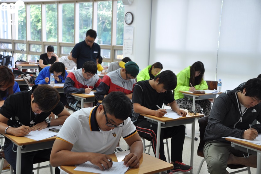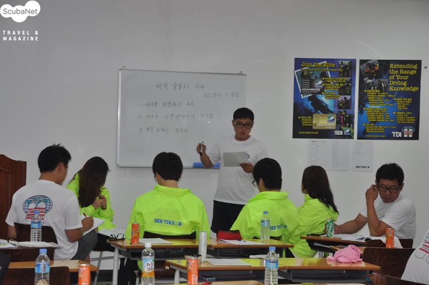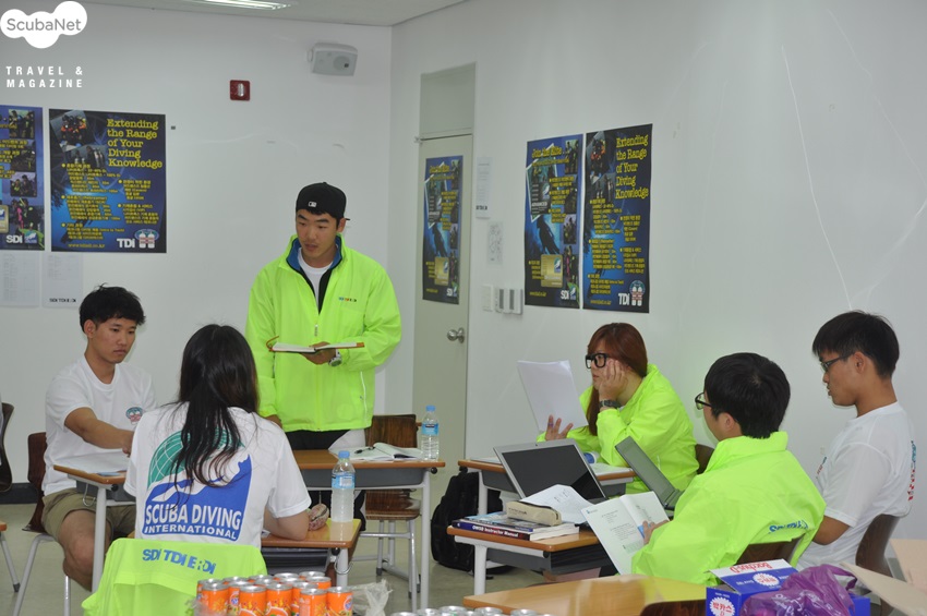 지난 6월 28일부터 7월 3일까지 울진해양레포츠센터에서는 SDI/TDI/ERDI에서 주최하는 SDI 장학생 강사과정이 진행됐다. SDI는 지난 2007년부터 매년 대학생들을 대상으로 장학생 강사과정을 개최하고 있다. 현재 6기째에 이르고 있는데 지금까지 이 프로그램을 통해 배출된 강사가 100명을 넘는다고 한다. 장학생 강사과정은 대학생 중 100 로그 이상, 다이브 마스터 이상의 다이빙 경력이 있는 학생들이 동아리나 다이빙 숍의 추천을 받아 신청하게 된다. 강사과정에 필요한 모든 비용을 SDI/TDI/ERDI 본부에서 지원하며 학생들은 8일간의 숙식비용만 부담하면 되는 파격적인 조건이다.기자는 마치 대학생인 것처럼 학생들 사이에 잠입하여 취재를 했는데 다른 학생들과 똑같이 시험을 보고, 매일 숙제를 하고 아침마다 구보를 하는 등 빡빡한 일정을 소화해야 했다. 다소 힘들기도 했지만 대학생들의 뜨거운 열정과 톡톡 튀는 발랄함, SDI 본부의 세심한 배려로 어디에서도 경험할 수 없는 특별한 시간을 보냈다.울진에 도착해 먼저 "원정"을 마치고 온 이대생들을 만났다. "원정"이라는 표현이 필자에게는 낯설었는데 대학 동아리에서 가는 투어를 그렇게 부르는 듯 했다. 며칠간의 원정으로 피곤할 법도 한데 다들 기운이 넘친다. 평소 "이대생"에게 갖고 있는 이미지와는 사뭇 다른 건강하고 활기찬 학생들이다. 일단 재밌는 아이들인 것 같다. 밤에는 이론 시험을 대비해 모두 자.발.적.으로 강의실에 모여 공부를 했다. 강의실에서 대학생들과 공부라니. 마치 시험기간의 도서관에 온 것 같은 기분이었다. 강사과정 첫째 날 바로 이론 시험이 있기 때문이었다. 아무 것도 가르쳐주지 않은 상태에서 시험이라니 조금 의아할 수도 있지만 내막을 알면 그렇지 않다. SDI에서는 모든 학과 과정에 대한 교육 자료를 동영상으로 만들어 놓아 학생들 스스로 학습이 가능하다. 동영상 강의는 교재의 저자인 정의욱 본부장의 강의를 녹화한 것으로 단체의 정신이나 내용에 대한 설명이 가장 정확하게 담겨 있다. SDI에서는 이런 교육 자료를 강사들에게 무료로 배포한다. 학생들은 모두 이 자료를 활용해 열심히 공부를 해왔고, 그 덕에 한 명의 탈락도 없이 모두 학과과정 평가를 통과했다. 학과 시험 후 아직은 약간 서먹한 분위기에서 23명의 인원을 네 개 조로 나누었다. 이름은 "SDI팀", "TDI팀", "ERDI팀", 그리고 "강사팀"이었다. 이후의 일정은 모두 팀 단위로 진행되었다.
