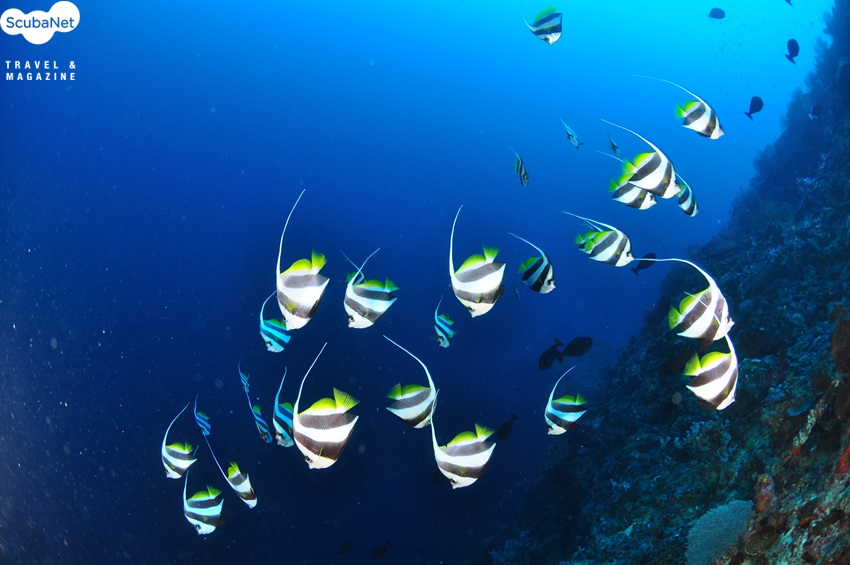 재호흡기로 다이빙하며 접근하여 촬영한롱핀배너피쉬 무리