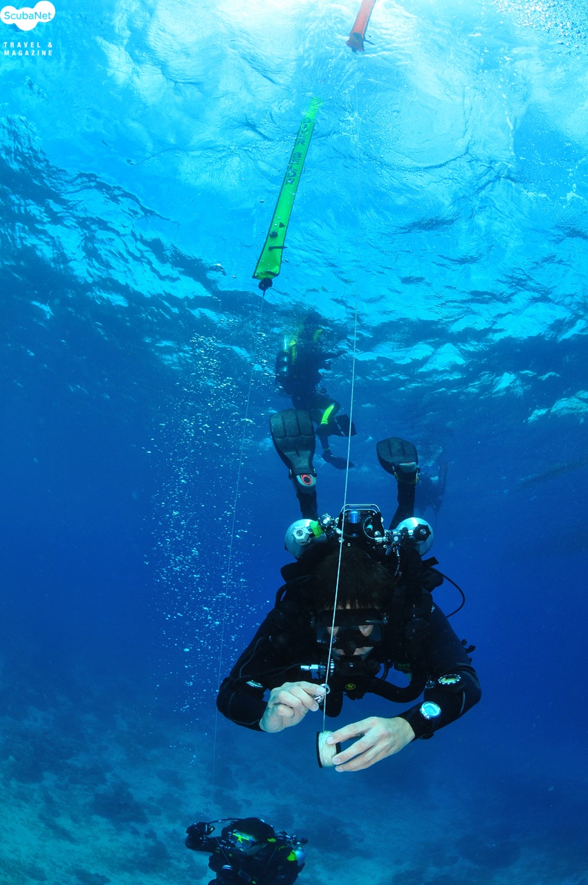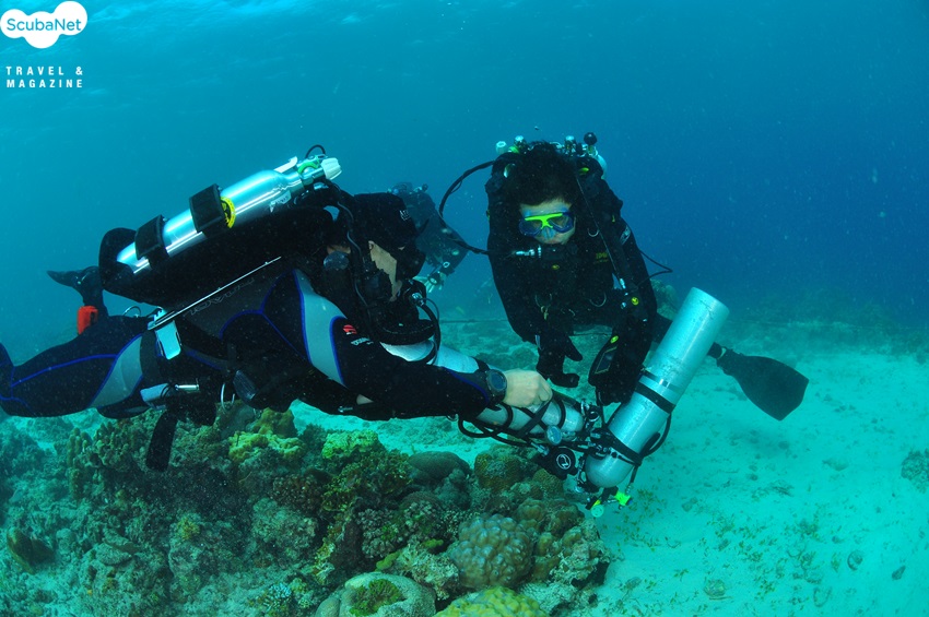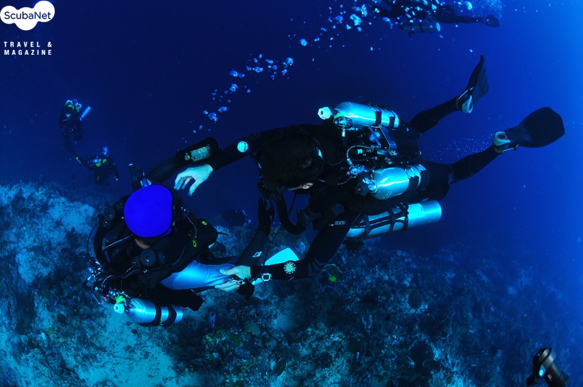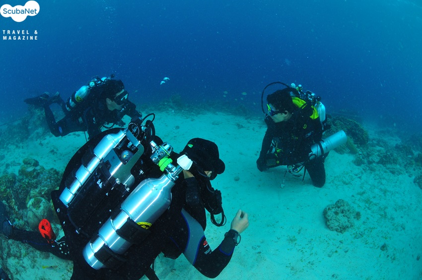 MK6 재호흡기 다이버들이 힐루퉁안 섬의 리이프를 따라 이동하는 모습