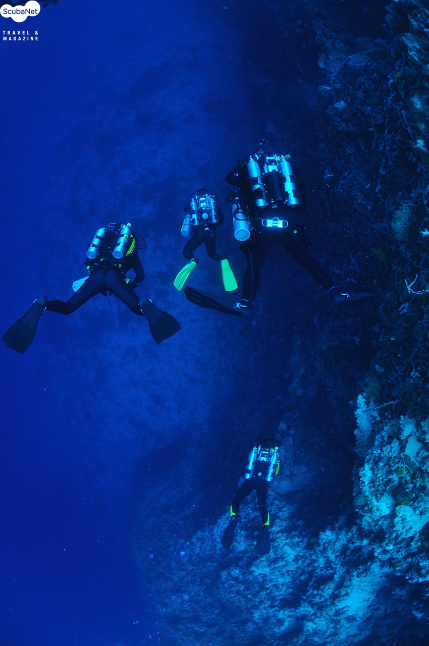 올랑고섬의 절벽을 따라서 이동하는 재호흡기 다이버들