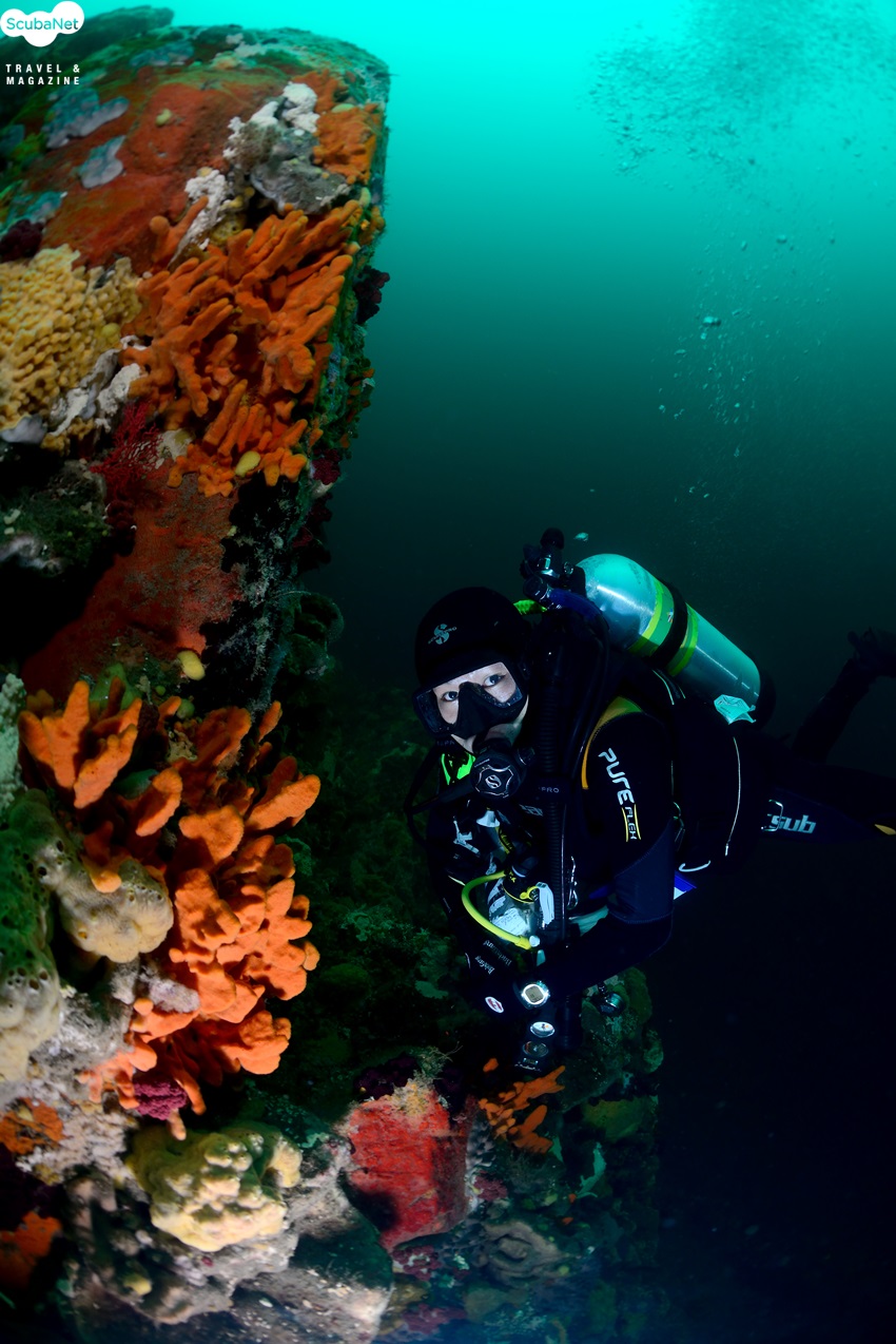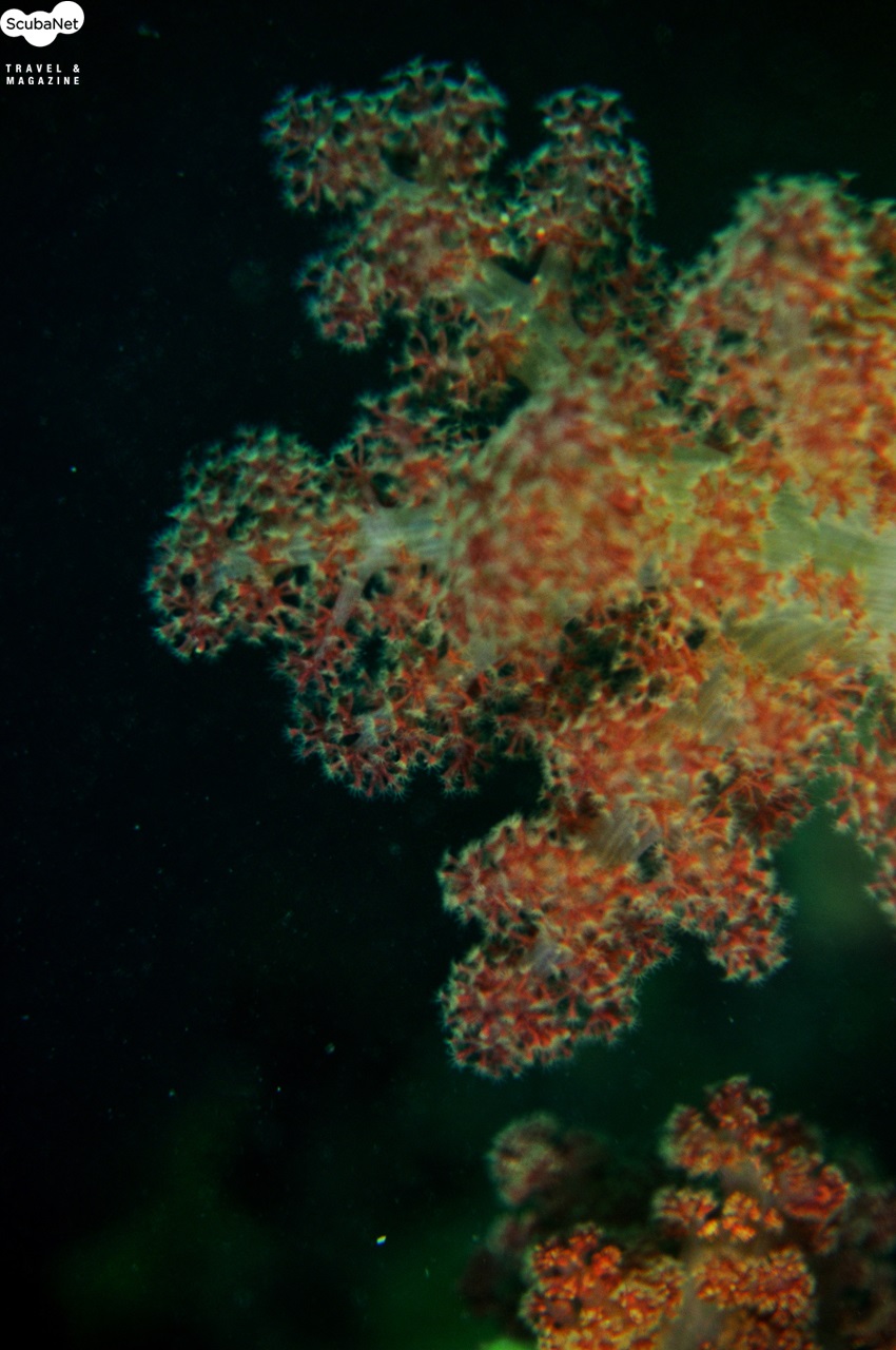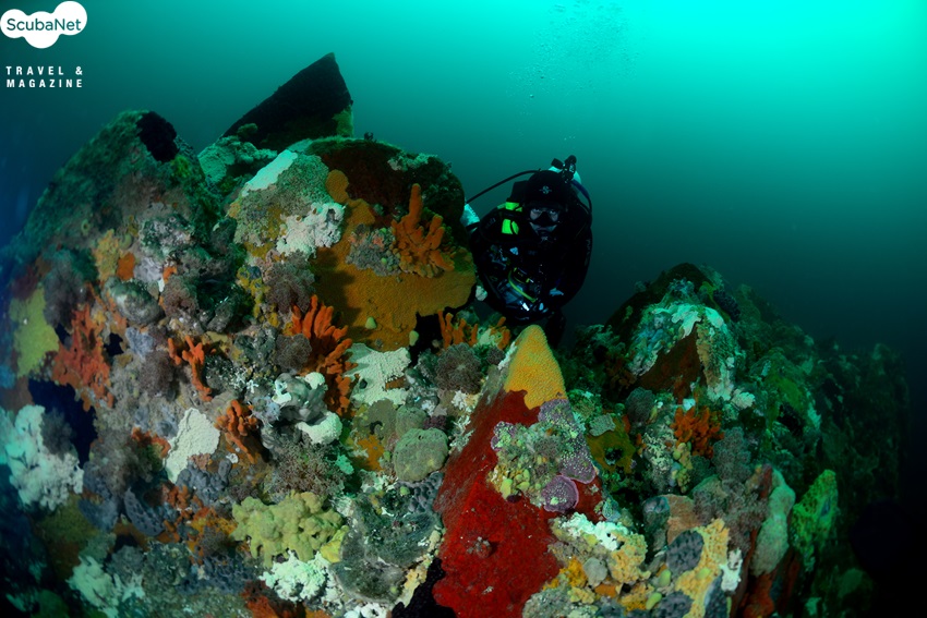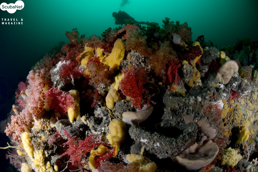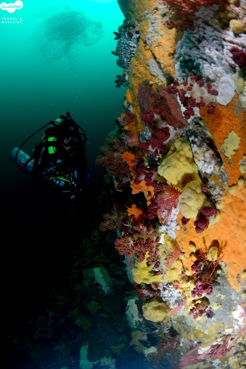 절벽의 연산호 군락과 다이버