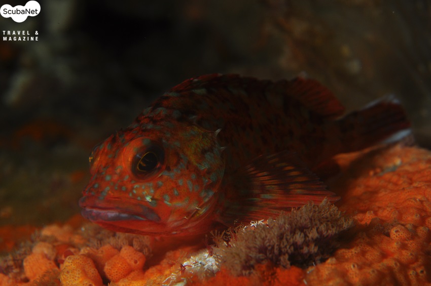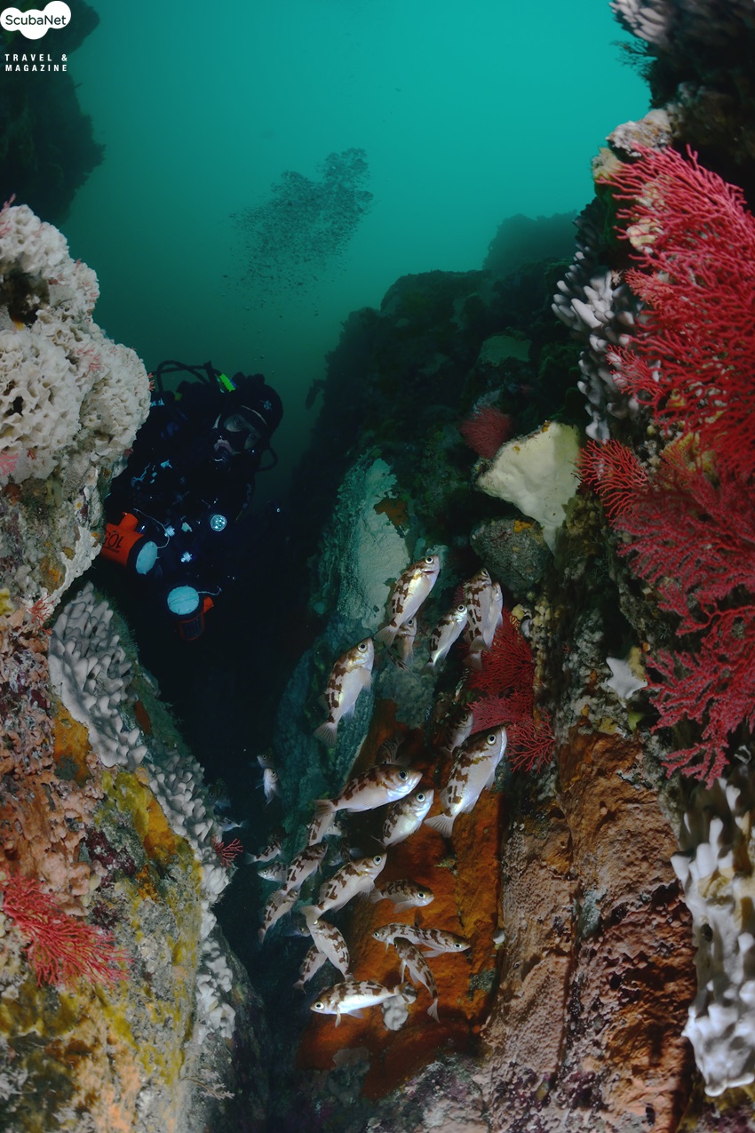 계곡 사이의 불볼락 무리와 다이버. 모델/우성원