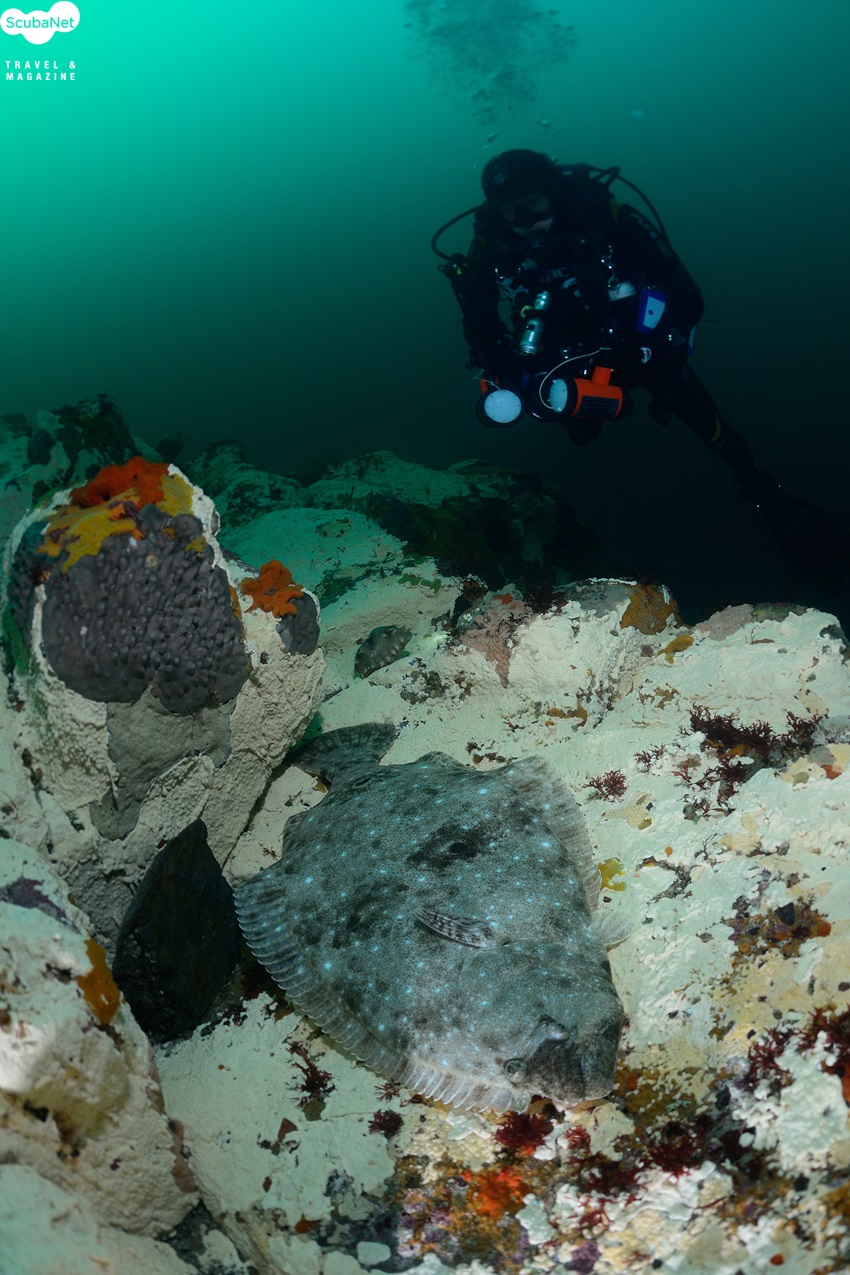 암반에 앉아있다가 급하게 자리를 피하는 넙치