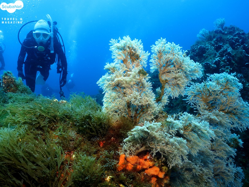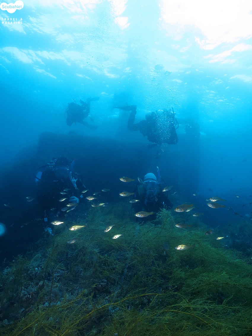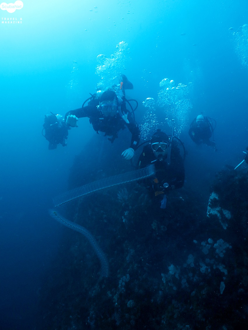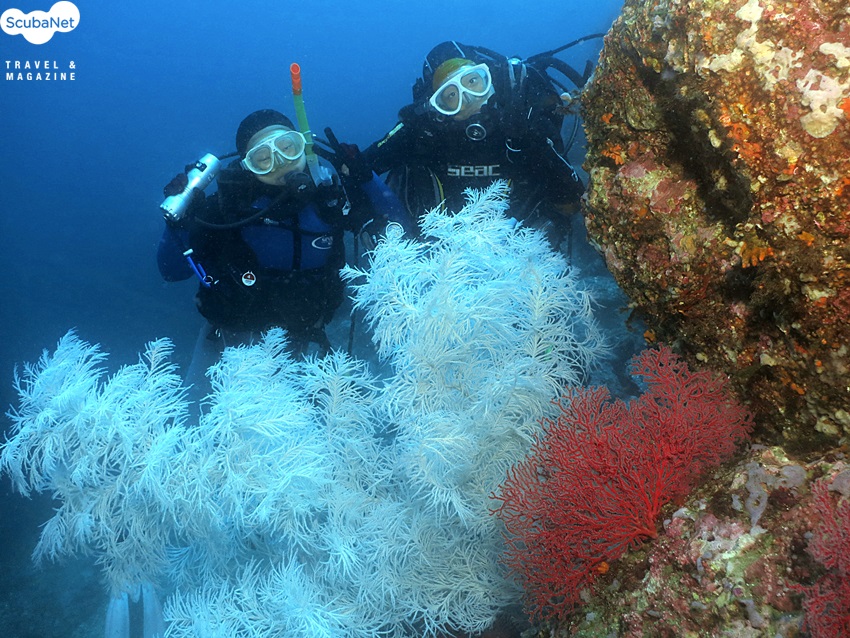 죽도 선착장 인근에서 하강하여 북저바위 방향으로 유영을 하면 급격한 슬로프를 따라 주황색 담홍말미잘 군락이 넓게 형성되어 있으며, 20미터부터 하얀 해송이 군데군데 나타나며, 수온약층을 지나면 시야가 뻥 뚫리며 해송군락이 한 눈에 들어온다. 멋진 해송을 본 뒤 슬로프 아래를 보면 더 크고 멋진 해송이 부르며, 이 해송 군락은 60미터까지 이어진다. 깊이 내려갈수록 해송은 더 크고 풍성한 자태를 뽐내고 있어 그 유혹을 뿌리치기가 쉽지 않다. 해송 주변에는 자리돔 무리가 상주하며, 가끔 대형 방어떼가 지나가기도 한다. 올해는 40미터 수심에서 수천마리의 불뽈락 무리를 만났으나 예년과 반대로 깊은 수심에 부유물이 많아 아쉬움이 남는다. 대심도 다이빙 교육을 하기에 적합하여 매년 레벨업 및 어드밴스드 나이트록스 교육을 이 포인트에서 하고 있다.