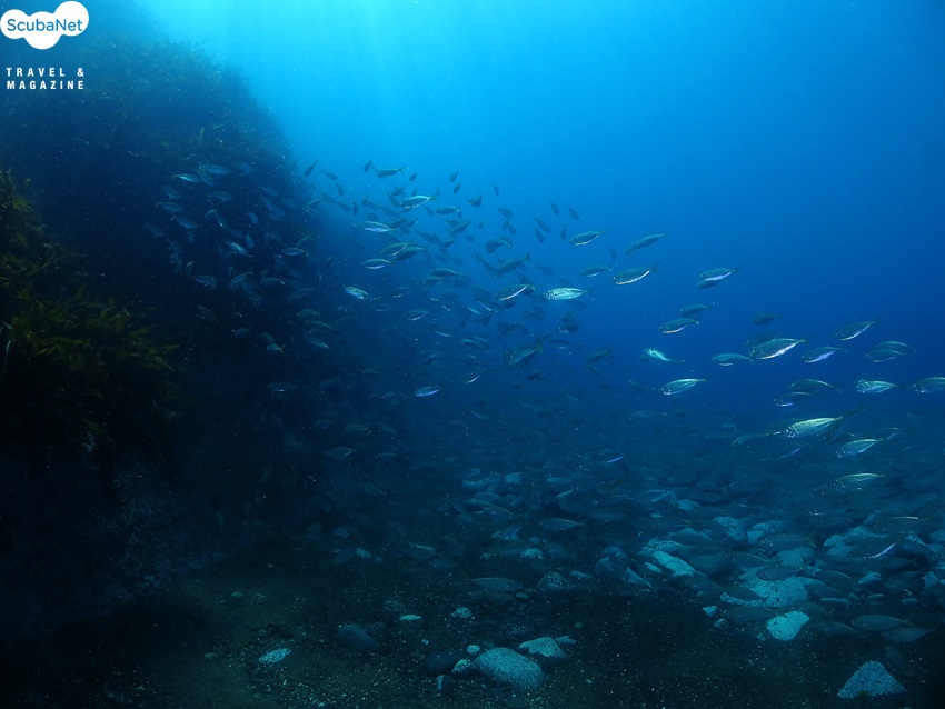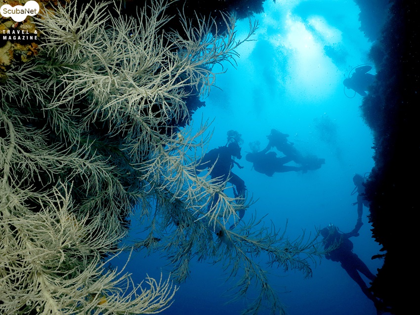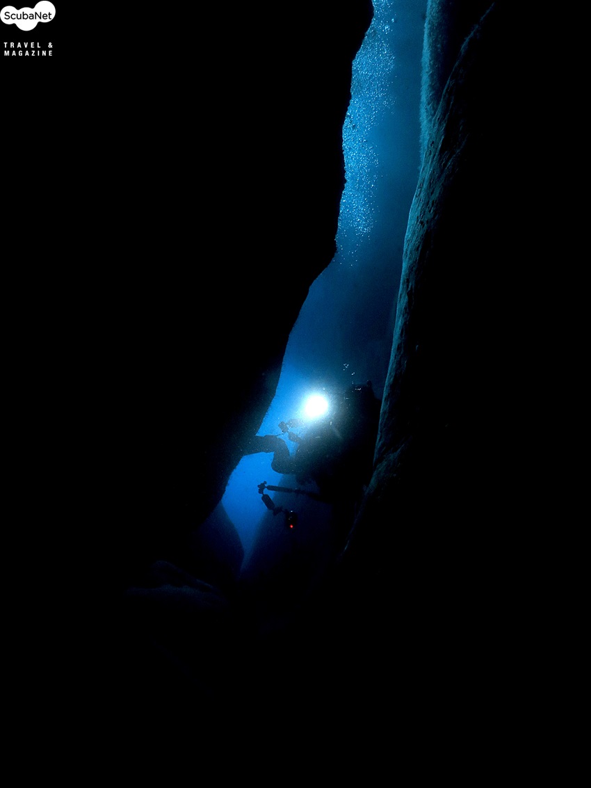 관음도에 바다를 향해 있는 두 개의 동굴로 안으로 깊지는 않지만 수중으로 직벽 형태로 이어져 멋진 지형을 연출하고 있다. 동굴 입구에서 입수하여 동굴 안쪽으로 들어가려면 좁은 틈을 지나가야 하며, 수면을 통해 들어오는 햇살과 함께 어우러져 장관을 이룬다. 동굴 밖으로 나가 외해로 나가면 커다란 바위 지형에서 혹돔을 만날 수 있으며, 커다란 방어떼와 조우할 확률이 높은 포인트이다. 절벽에는 다양한 산호가 서식하고 있으며, 얕은 수심에는 홍합이 군락을 이룬다.
