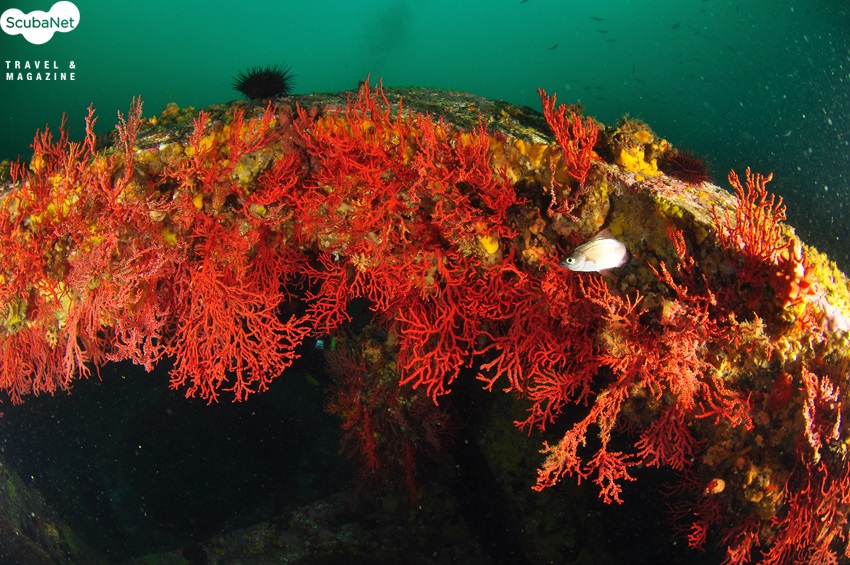 하강줄을 따라 수심 20m 부근에 내려가니 인공어초가 수북이 쌓여있었다. 제멋대로 눕기도 하고 비스듬하게 놓이기도 한 모습이 재미있었다. 인공어초를 구경하고 그 안을 누비는 쥐놀래미를 쫓다보니 인공어초 더미의 끝부분에 도착했다. 작은 난파선이 하나 놓여있고 그 뒤로 또 다른 인공어초 단지가 있었다. 인공어초에는 해면과 빨간색의 부채뿔산호가 무성히 붙어 알록달록한 색상의 화려한 자태를 뽐냈다. 커다란 쥐놀래미 여러 마리가 어초를 사이를 누비고 다녔지만 쫓아다니기가 만만치 않았다. 바닥의 쥐놀래미를 쫓다가 몸을 일으켜 위를 보니 화려한 인공어초 위로 망상어 떼가 재빨리 이동하며 장관을 이루었다.
