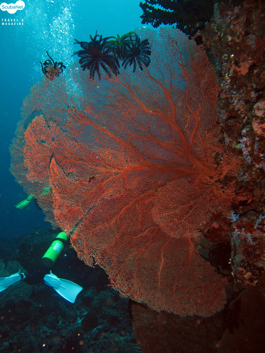 The Canyon 이 곳의 캐년은 커다란 두 개의 바위로 이루어져 있다. 5m 에서 시작된 커다란 바위는 30m까지 이어지며 큰 관문을 이룬다. 두 개의 바위가 만나는 지점에서 바위 꼭대기 부분은 수심 10m, 바닥은 수심 22m에 걸쳐져 있으며 가운데에 벌어진 틈은 다이버들이 쉽게 지나다닐 정도의 크기다. 강한 조류가 흐르는 경우 이 바위 뒤쪽에서 조류를 피하며 대형 어류들이 조류에 대항하여 유영하는 것을 관찰할 수 있다. 바위 자체는 특별한 산호초는 없지만 깨알같이 조그마한 산호들이 붙어 있으며, 여기에 엄청난 수의 댐젤, 안티아스 들이 서식하는 모습은 정말 장관이다. 캐년을 이루는 두 개의 바위 중 수심이 깊은 곳에 위치한 바위는 30m까지 뻗어 있는데, 이 바위 전체를 둘러싸고 서식하는 부채산호들은 마치 봄날에 진달래 언덕을 보는 듯 하다