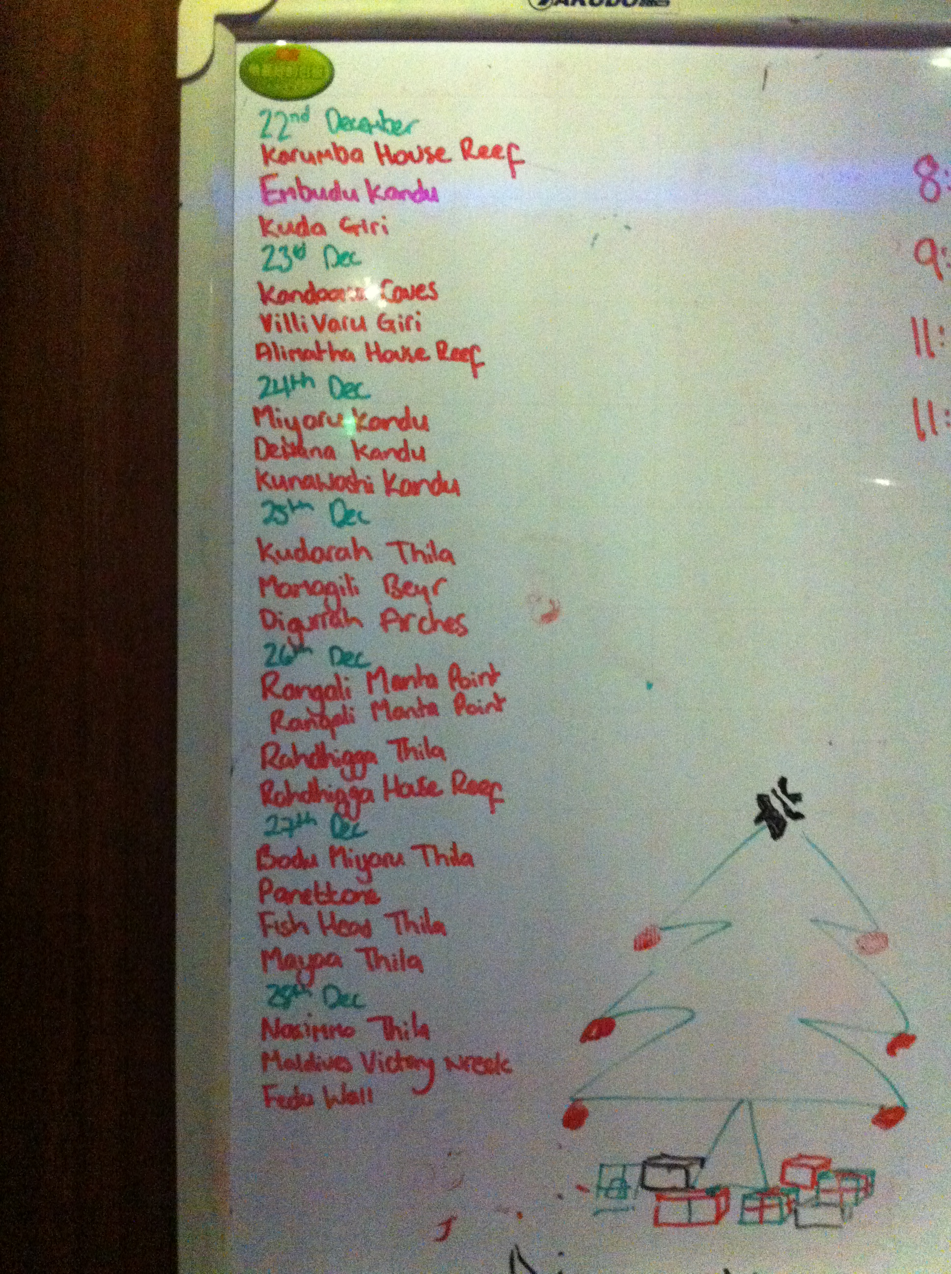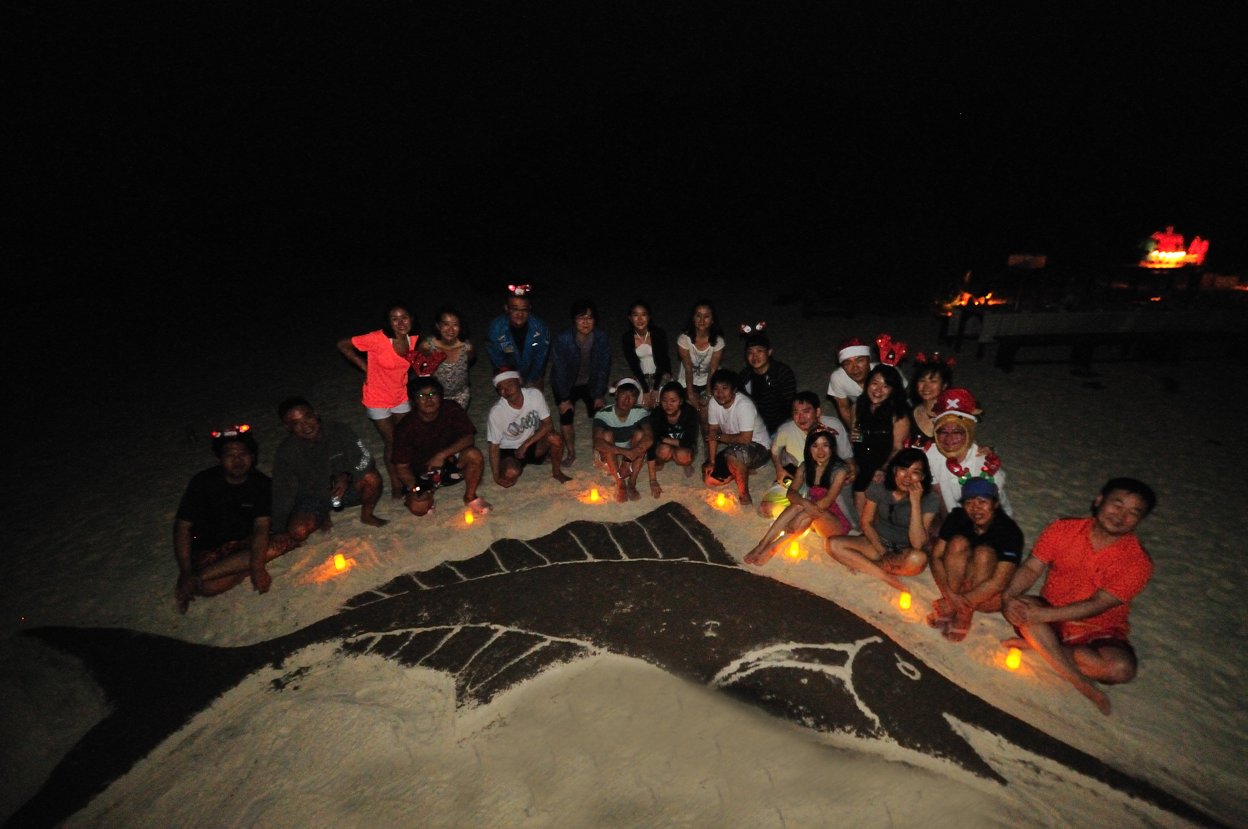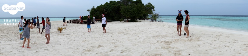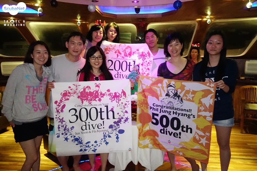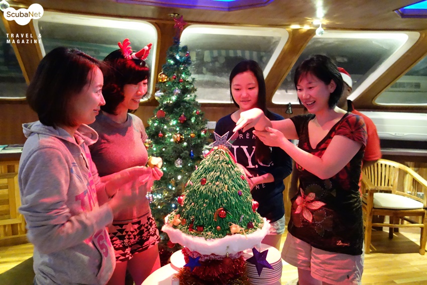 이번 투어 기간에는 크리스마스가 있었다. 이슬람 국가에서의 크리스마스라니 독특한 느낌이 들었다. 외국인을 위한 리브어보드와 리조트는 보세구역처럼 어느 정도의 음주가 허용이 되듯이 크리스마스 트리와 깔끔한 크리스마스 장식을 하고 있다. 크리스마스 이브에는 야간다이빙을 접고 무인도에 내려 아름다운 해변에서 크리스마스 파티를 하였다. 짙푸른 바다 위에서 선상생활을 하던 우리에게 환상적인 터키색의 해변을 자랑하는 몰디브의 섬에 상륙 하는 것만으로도 즐거운 일이었다. 게다가 해변에서의 촛불과 함께하는 크리스마스 파티는 모두가 행복해지는 순간이었다. 청새치가 조각된 해변에서 BBQ와 씨후드와 같은 맛난 음식과 시원한 맥주는 몰디브의 아름다운 추억을 마음 속 깊이 새겨놓는 멋진 파티가 되었다. 해변파티를 마치고 돌아온 배에서는 이번 투어에서 기념할 일이 있는 분들을 위한 케익 파티가 로비의 크리스마스 트리 앞에서 이어졌다. 투어 중 500회, 300회, 200회 다이빙을 기록한 분, 생일인 분, 결혼기념일인 분 등 일정의 언저리 기념일까지 모두 모아 축하를 하고 기념사진을 촬영하였다.