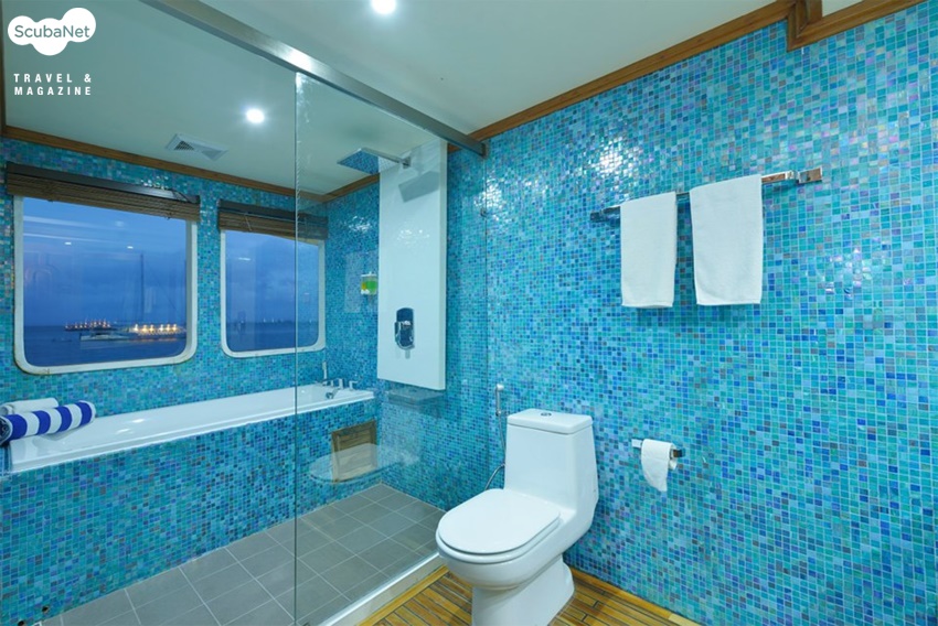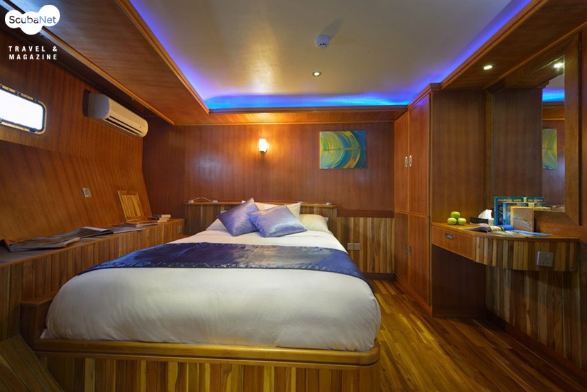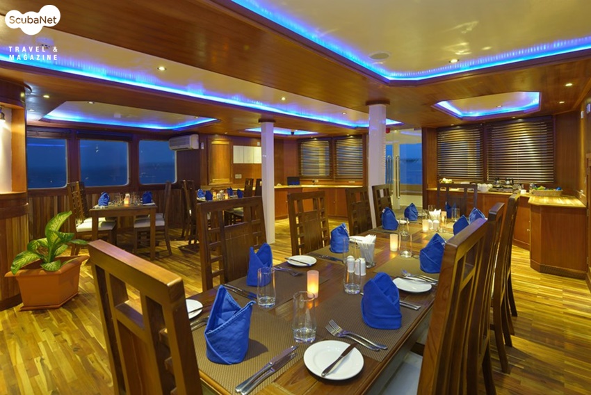 구성된 총 11개의 선실에 최대 24명의 게스트를 수용할 수 있으며, 모든 선실에는 샤워를 할 수 있는 널찍한 화장실과LCD TV와 DVD, 세이프티 박스, 전화, 미니바와 다양한 수납공간이 있다. 선장과 매니저, 다이브마스터 등 13명의 스텝들이 편안한 다이빙과 항해를 준비하고 있다. 데크는 4개 층으로, Lower Deck에는 객실이 있으며, Main Deck에는 안락한 쇼파와 대형 TV가 있는 로비와, 맥주, 와인, 샴페인 등을 마실 수 있는 바, 품격있는 식사를 할 수 있는 식당과 주방이 있으며, Top Deck에는 킹사이즈 더블베드와 쇼파가 있는 특실과 시원한 전망의 조타실, 선원객실이 있으며, Sun Deck에는 자쿠지와 널찍한 선데크가 있다. 다이빙은 55ft의 도니(Dhoni)라 불리는 부속 선박에서 이루어지며, 픽업보트의 개념이 아니라 공기통을 비롯한 장비를 실고 모선과 같이 다니며 모든 다이빙을 진행한다. 픽업보트가 있지만 섬에 상륙하거나, 스텝들의 업무용으로 사용한다. 모선에 2대의 바우어 콤프레셔가 있으며, 9개의 뱅크가 있는 나이트록스 멤브레인 시스템을 갖추고 있어 정확한 나이트록스 충전을 빠른 시간 내에 할 수 있다. 모든 다이빙에 32% 나이트록스를 무료로 제공하니 나이트록스 C-card 지참은 필수!