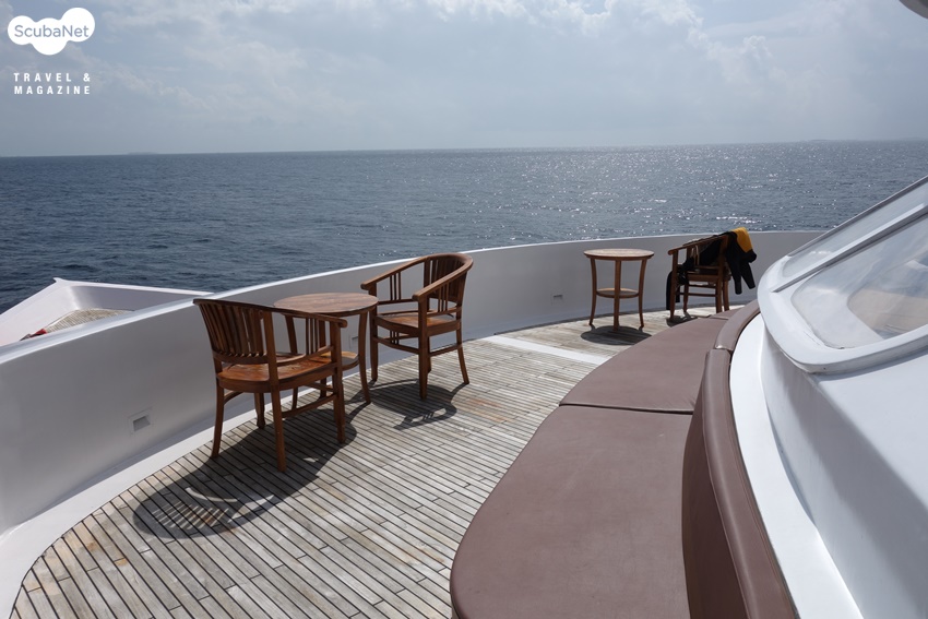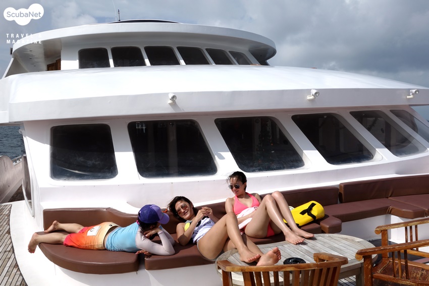 다이빙과 다이빙 사이에는 두세 시간 정도의 여유가 있다. 나이트록스를 이용하지만 전반적으로 수심이 깊은 몰디브의 다이빙은 충분한 휴식이 필요하다. 질소와 더불어 산소포화도를 낮출 수 있으니 더욱 요긴하다. Mv Maldives Princess에는 Deck 마다 태닝을 할 수 있는 곳이 있으며, 맨 위의 Sun Deck에서는 태닝과 함께 자쿠지에서 피로한 몸을 달랠 수 있다. 이번 투어 기간에는 흐린 날이 많았지만, 태닝을 하기에는 충분하였다. 여러 그룹이 프라이버시를 침해당하지 않으며 휴식을 할 수 있을 만큼의 충분한 공