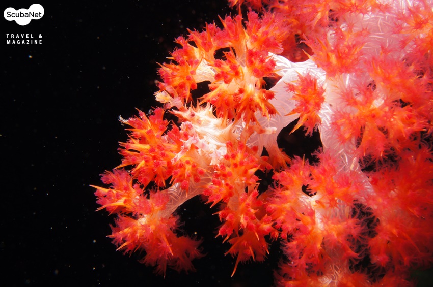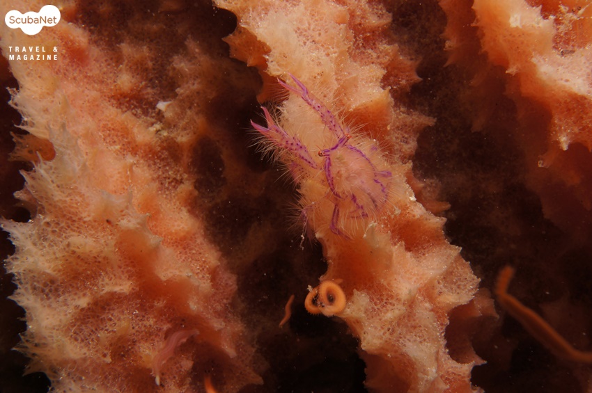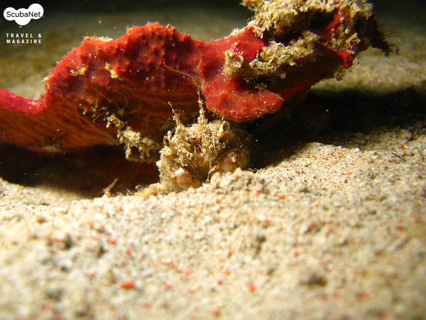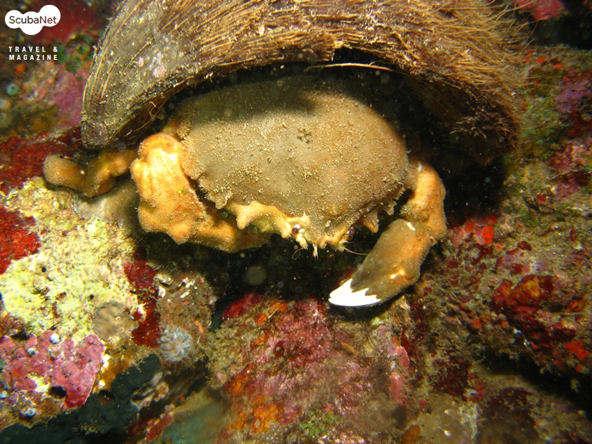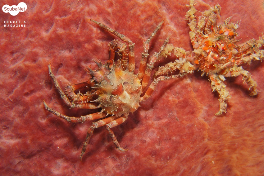 연산호의 폴립과 같이 위장하고 있는 캔디 크렙(Candy Carb, 좌)와 야간에 죽은 산호 틈에 자리잡고 있는 게(우)