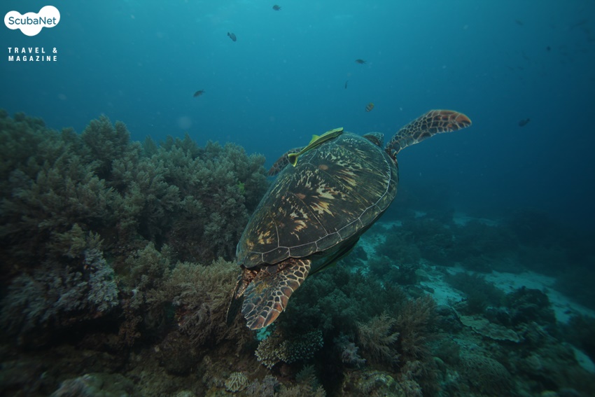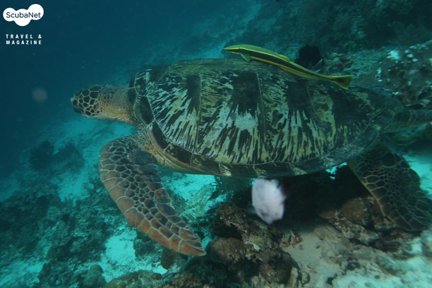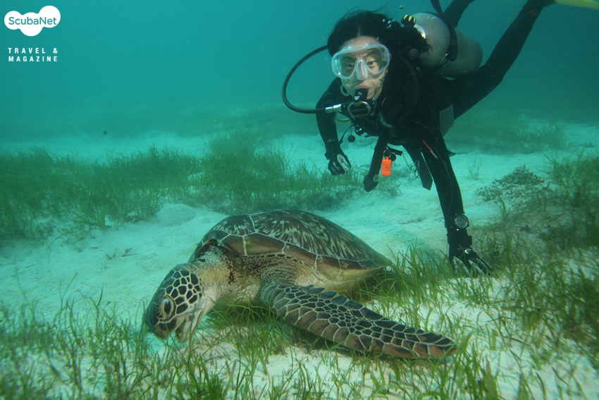오후에 또 다시 블랙 포레스트로 입수를 하였다. 수심 7 – 9m 정도의 하얀 모래 밭에 잔디처럼 생긴 해초가 전체적으로 깔려 있었다. 이것을 보는 순간 나는 이곳이 거북들의 천국이라고 직감하였다. 뜯어 먹을 풀이 사방에 널려있고 수심이 얕으니 내가 거북이라도 이곳에서 살겠다. 그리고 보니 여기 저기에서 거북들이 눈에 자주 뜨인다. 입수를 하자마자 아주 커다란 거북을 만났으나 조류가 세어서 접근 할 수가 없었다.