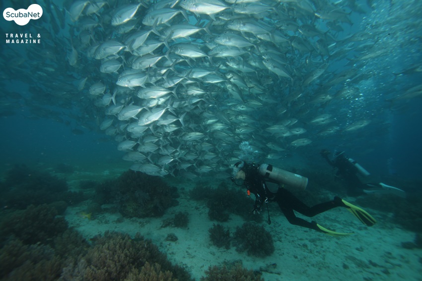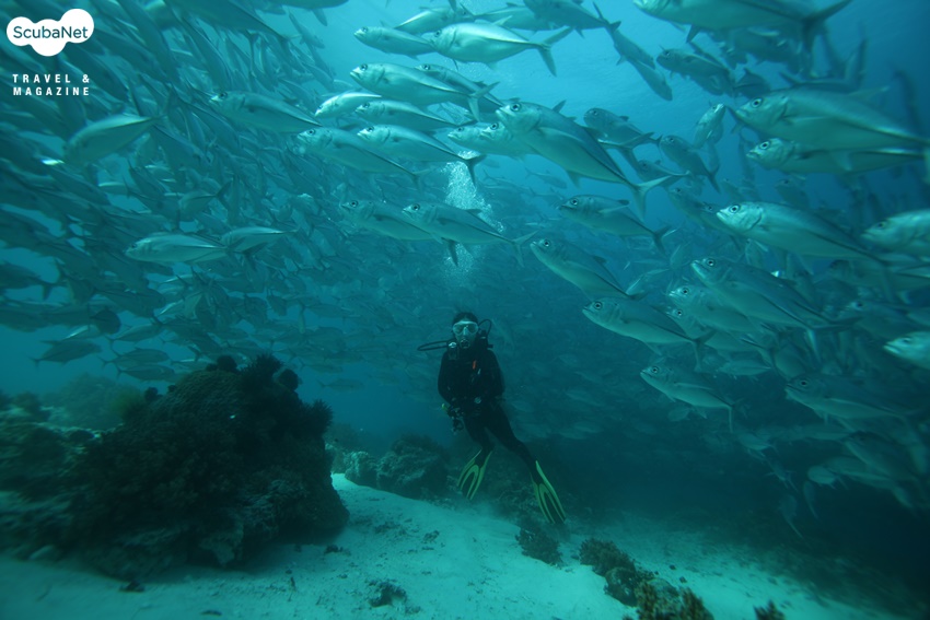 조류가 제법 있었는데 수심 7-8m 정도에서 우리는 수천 마리의 잭피쉬 무리를 만났다. 잭피쉬들이 다이버들을 많이 보았는지, 전혀 도망을 가지 않고 유유히 내 곁으로 지나간다. 스쳐 지나면서 나를 경계하며 돌려대는 눈동자가 너무나 순진하고 재미있다. 정말로 경이로운 장면 이었고 내 얼굴에 미소가 피어났다. 내가 잭피쉬 무리의 중앙을 뚫고 들어가도 이 녀석들은 전혀 도망을 치지 않는다.