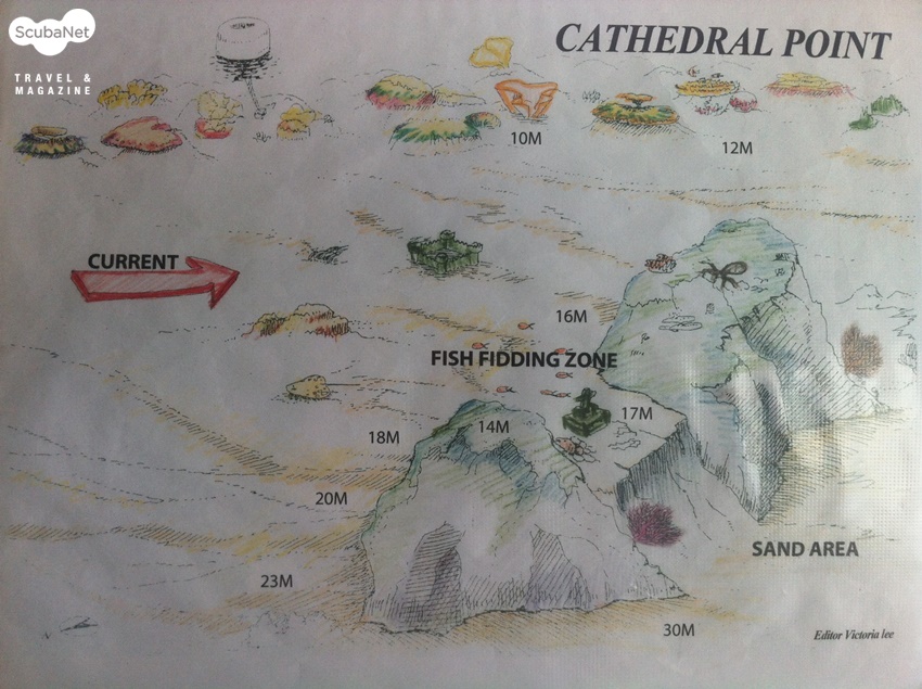 6. 지형지물다이빙에서 놓쳐서는 안 되는 지역 또는 잠재적인 위험요소 등과 같은 지형지물을 포함시킨다. 각 지형지물의 수심과 지형지물이 차지하는 범위를 측정한다.