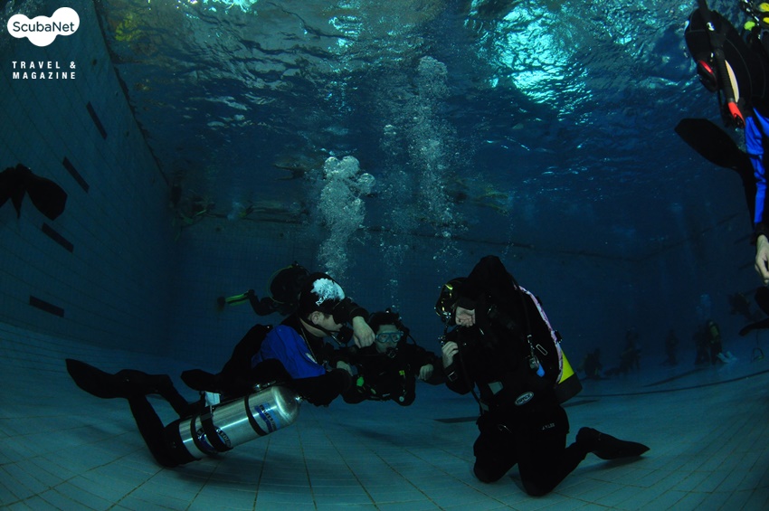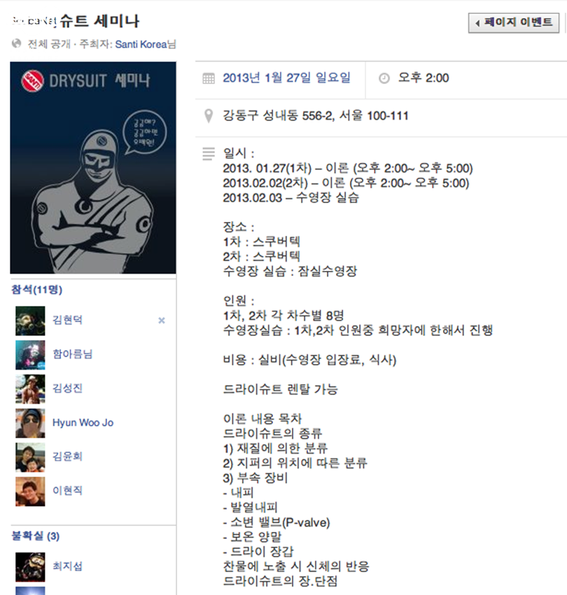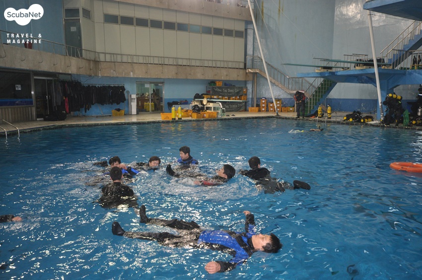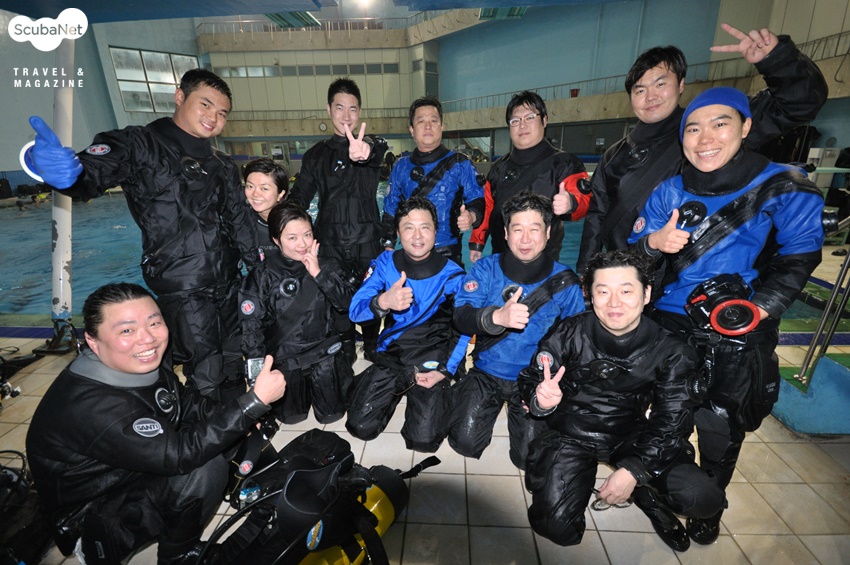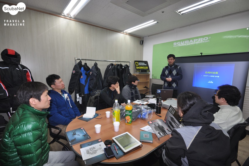 스쿠버텍 드라이슈트 세미나1월의 어느 날, 페이스북을 보는 중 재미있는 이벤트가 눈에 들어왔다. 스쿠버텍에서 하는 드라이슈트 세미나. 그동안 레귤레이터나 BCD 등의 장비에 대한 세미나 또는 수중사진 세미나는 자주 접해봤고 신제품 세미나도 흔히 있는 이벤트였다. 하지만 드라이슈트 세미나는 처음 접하는 이벤트였고 실습까지 있다고 하니 더욱 기대가 되었다. 드라이슈트만 가지고 실습까지 있는 세미나는 기자의 아는 범위에서는 처음이었다. 재미있는 이벤트가 생겼으니 재빨리 신청을 하고 세미나 날을 기다렸다. 먼저 실시된 이론 교육. 이론교육은 2차로 나누어 진행했고 1, 2차 이론교육 인원이 함께 수영장 실습교육에 참여했다.