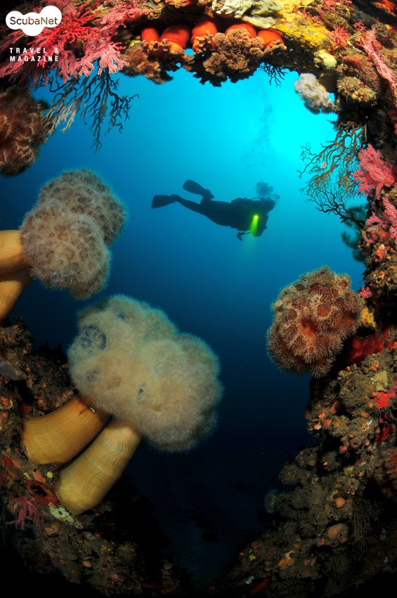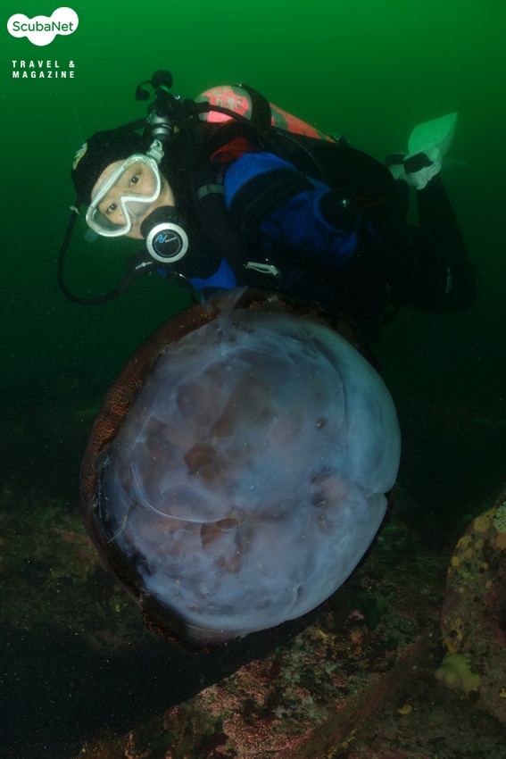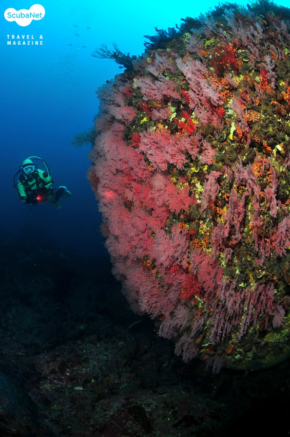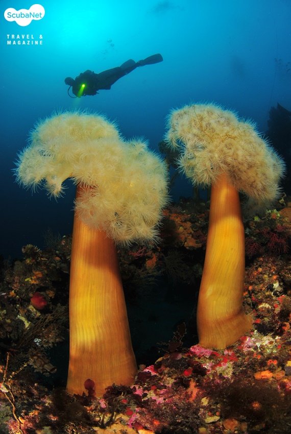 키 작은 빨간 섬유세닐 말미잘이 무성하게 활짝 핀 커다란 바위를 둘러보고 있으려니 마치 빨간 꽃이 가득한 정원을 거니는 기분이 들었다. 봄비가 촉촉하게 내리는 흐린 날의 정원처럼 조금 어둡지만 생명력이 넘치는 풍경이었다. 하얀 섬유세닐 말미잘과 뿔산호, 비단멍게가 잔뜩 붙어 있는 커다란 바위 두 개 사이를 지날 때는 예쁜 계곡 사이를 산책하는 것 같았다. 물기를 잔뜩 머금은 신비의 정원을 사뿐 사뿐 걷는 듯 가벼운 발걸음이었지만 20분, 25분.. 시간이 지나면서 5℃의 물은 서서히 냉기를 느끼게 했다. 걸을수록 몸이 따뜻해지는 뭍이 아니라 여기는 시간이 지날수록 체온이 뺏겨 추워지는 물속이니까, 이제 그만 올라가야할 시간이었다. 자, 오늘 다이빙은 여기까지! 이만 상승합시다~