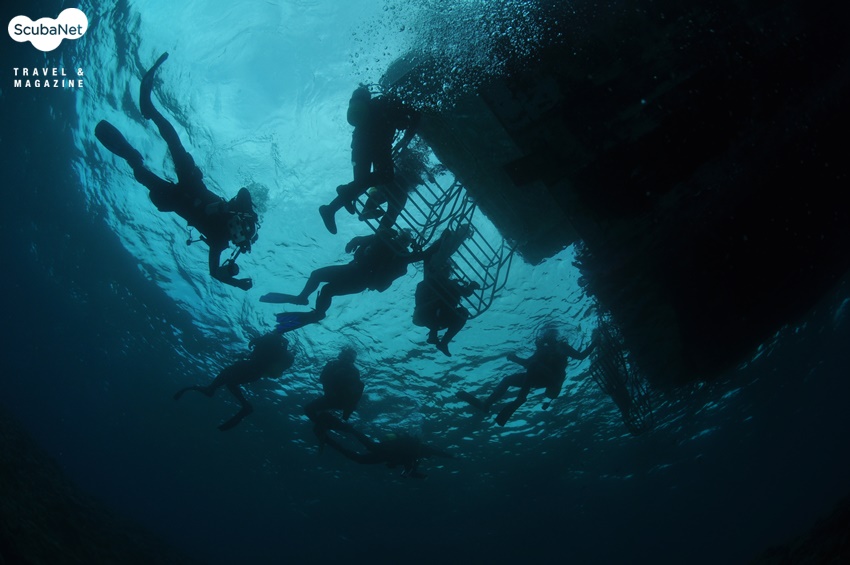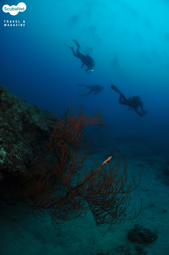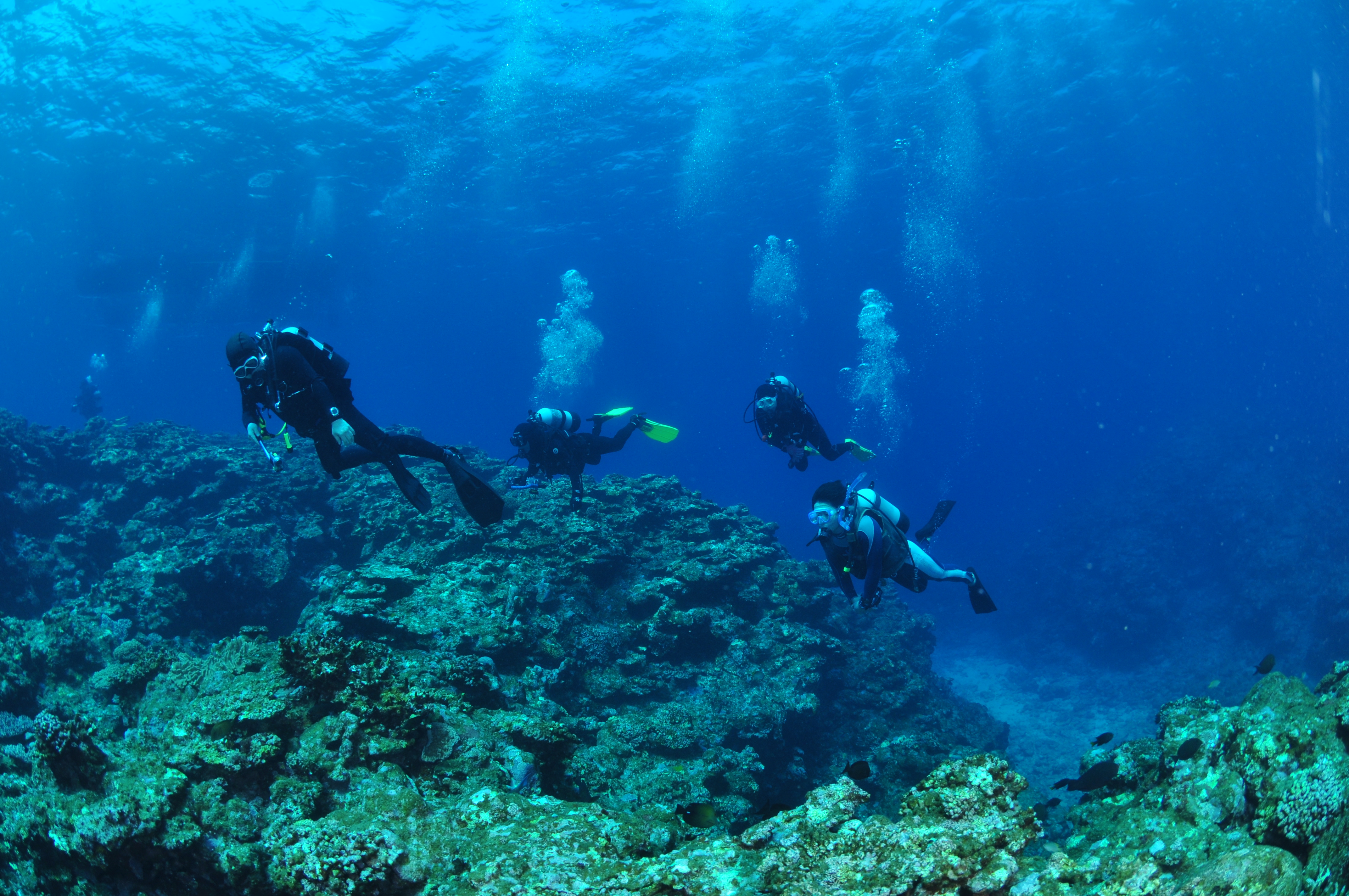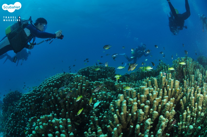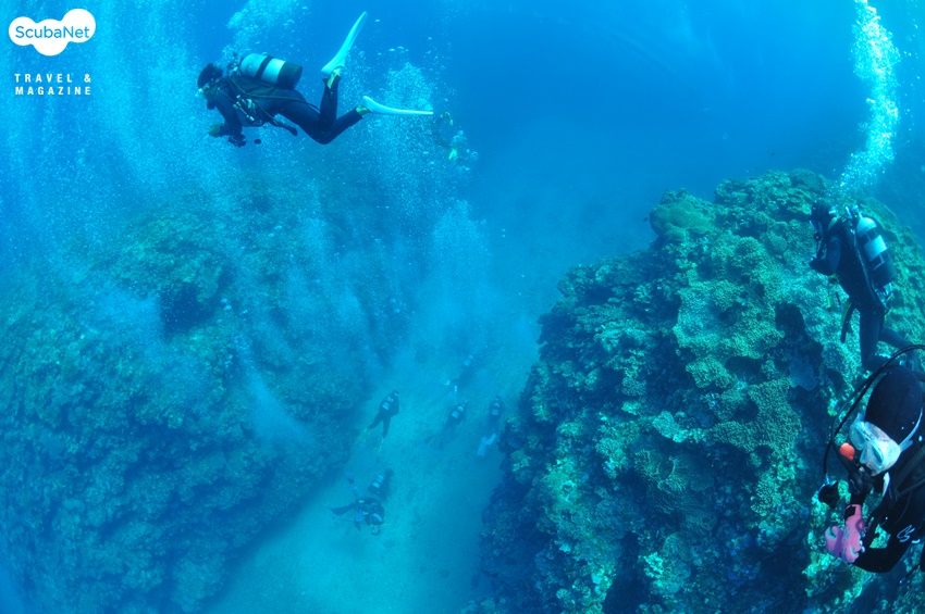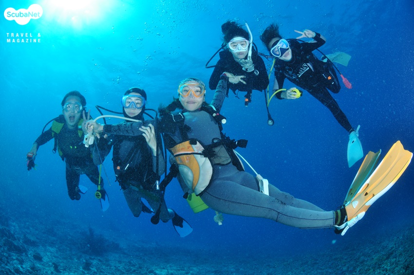 이번 이시가키 투어에서는 총 32명의 다이버가 2개의 배로 나누어 다이빙을 했어요. 각 배에서는 또 다시 3개조로 나누어 조별로 다이빙을 진행했고요. 같은 포인트에서 조별로 다른 루트로 다이빙을 하다 보니 물속에서 다른 조를 만나기도 했답니다. 조금 전에 배 위에서 봤던 사람들이지만 물속에서 만나면 또 반갑지요. 반갑게 서로 사진을 찍고 놀다가 다시 각자의 가이드를 따라 이동하곤 했죠.