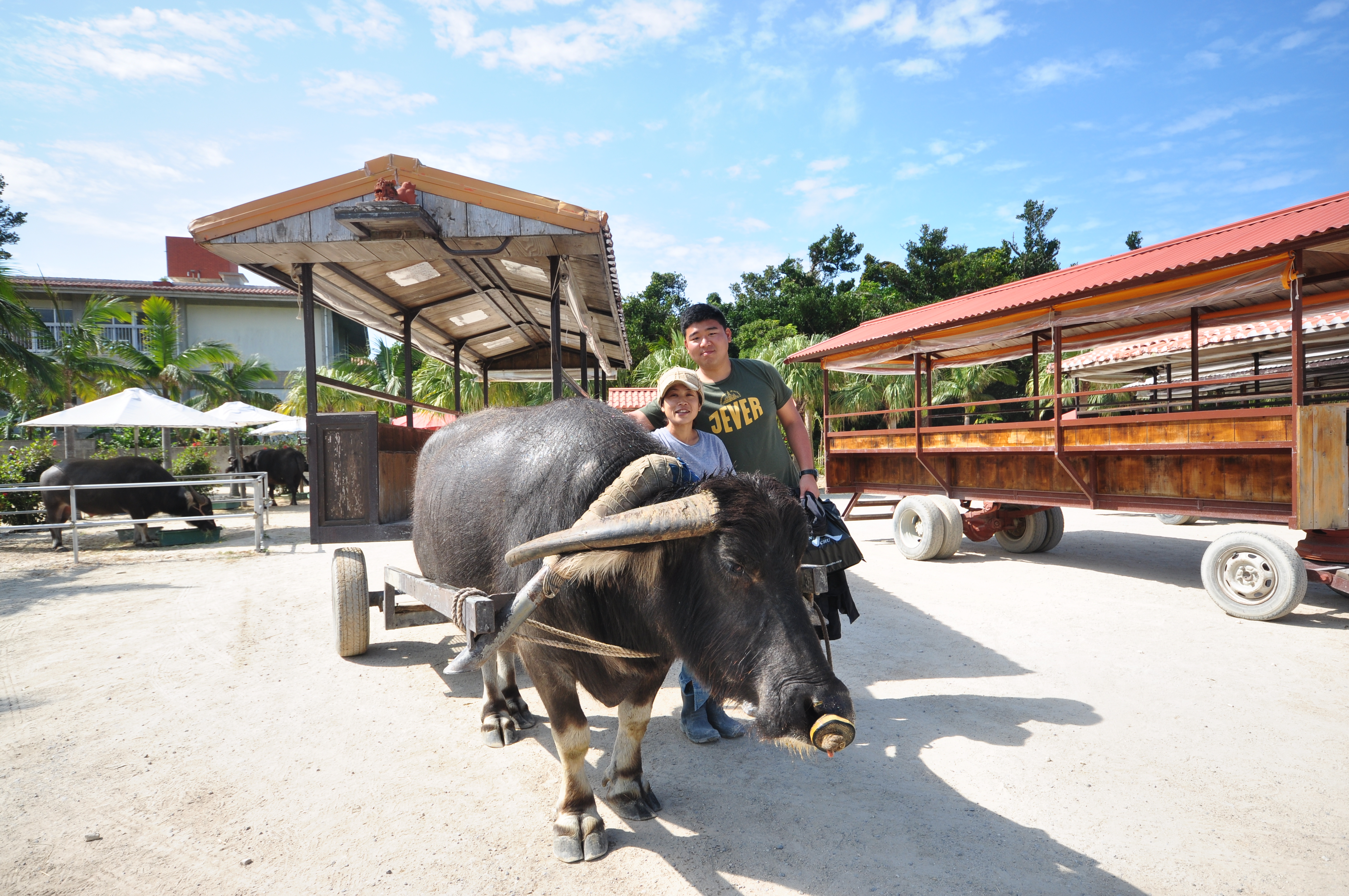 물소차를 타고 전통 마을 구경세번째 코스는 물소차를 타고 하는 다케토미 마을구경이었어요. 물소차는 우리나라의 달구지를 더 크고 길게 만들어 놓은 것이라 생각하면 되요. 하얀 모래를 깔아둔 예쁜 길과 까만 돌담, 그리고 다케토미의 낮은 전통가옥들은 활짝 핀 빨간 꽃과 더 없이 파란 하늘과 어우러져 아름답고 평온한 풍경을 보여줬어요.