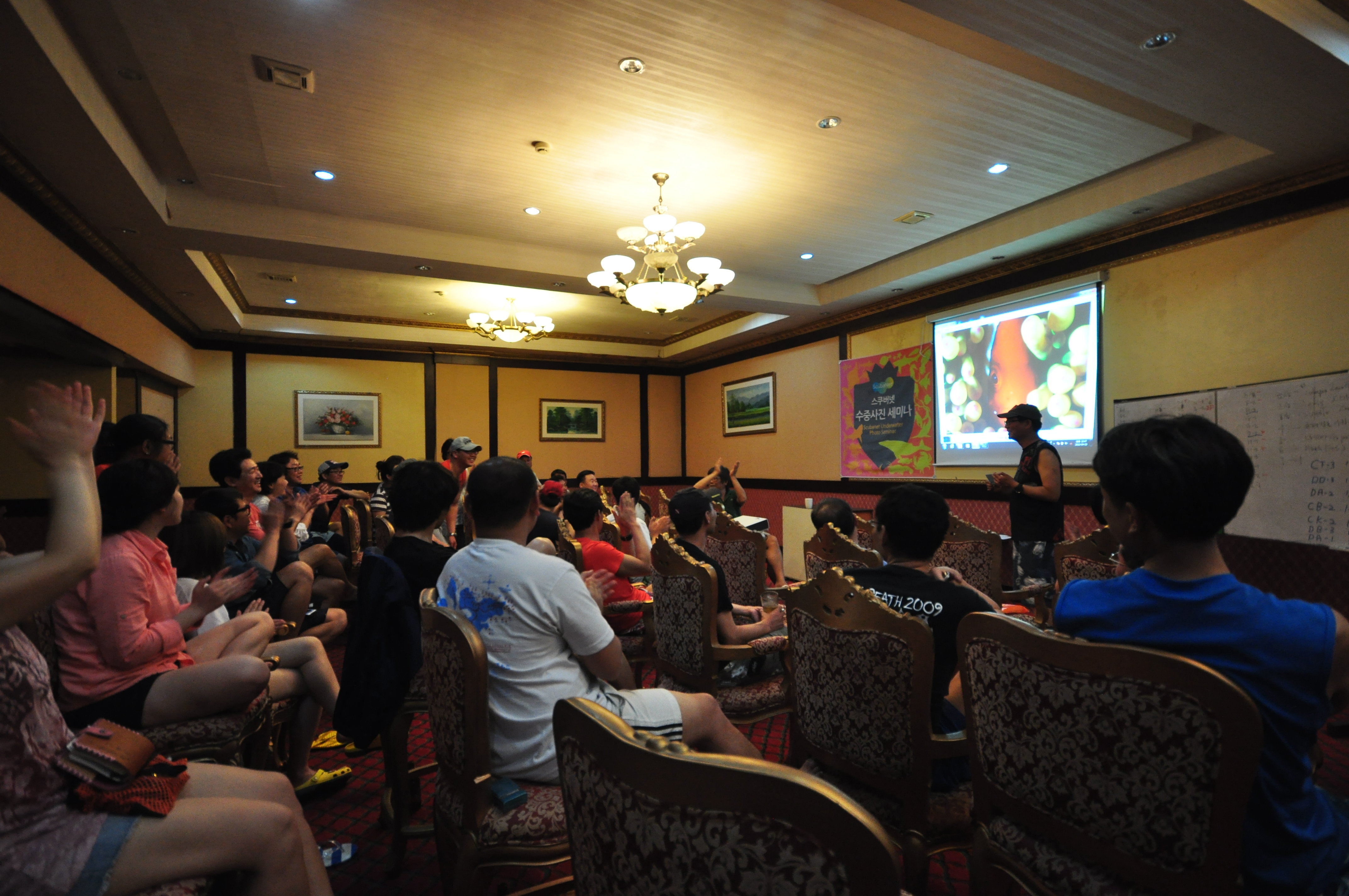 해양생물 보호와 촬영 에티켓에 대한 교육이번 행사를 진행하면서 스쿠버넷에서는 멋진 사진을 얻기 위해서 해양생물에게 피해를 주는 일은 없어야 한다고 분명하게 밝혔다. 심사위원들의 심사가 아니고 참가자들의 투표로 콘테스트가 진행되는 행사였기 때문에 참가자들 모두가 이런 부분에 공감을 하는 것이 중요했다. 그래서 DEPC의 김경석 부회장이 참가하여 첫날 다이빙 출발 전에 해양생물 보호와 촬영 에티켓에 대해 간단한 세미나를 가졌고, 촬영된 사진을 슬라이드로 볼 때도 인위적인 간섭이 들어갔는지 아닌지 참가자들이 알 수 있도록 지적해 주기도 했다.