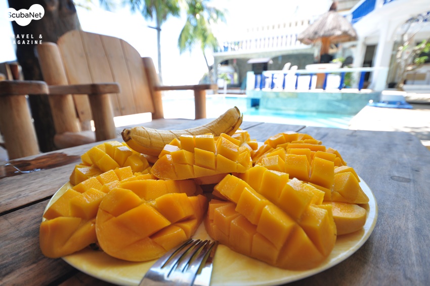 1년 전 새 단장을 했다는 리조트 신관은 밝고 쾌적한 느낌이었으며 매일 청결한 상태로 관리되고 있었다. 한국 방송을 볼 수 있는 TV가 갖추어져 있고 넓직한 베란다는 장비를 건조하기에도 좋았다. 리조트 곳곳에 선베드와 원두막 등 여유로운 쉴 공간이 마련되어 있었고 화려한 꽃과 나무가 어우러져 심신이 편안해지는 곳이었다. 매끼 식사는 다양한 식단으로 맛있는 반찬이 나왔고 수면 휴식 중에는 제철을 맞은 망고를 간식으로 풍족히 제공해주었다. 리조트 중앙에는 바다가 보이는 작은 수영장이 있는데 평범해 보이는 이 수영장에는 특별한 비밀이 하나 숨어 있다. 수영장 한 쪽 코너에 사람 한 두명이 통과할만한 작은 통로가 있어 그 사이를 오가며 놀 수 있는데, 수중 카메라까지 있다면 재미있는 사진을 찍으며 즐거운 시간을 보낼 수 있다.