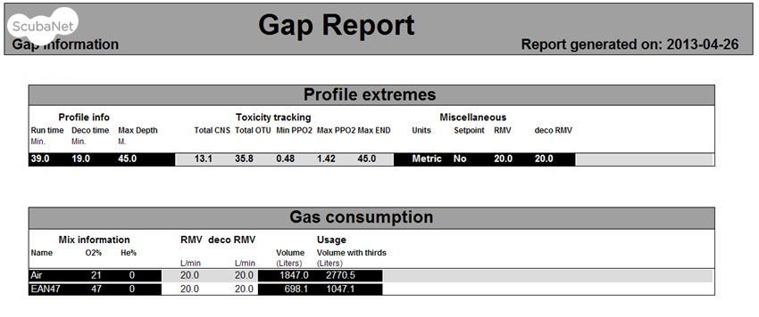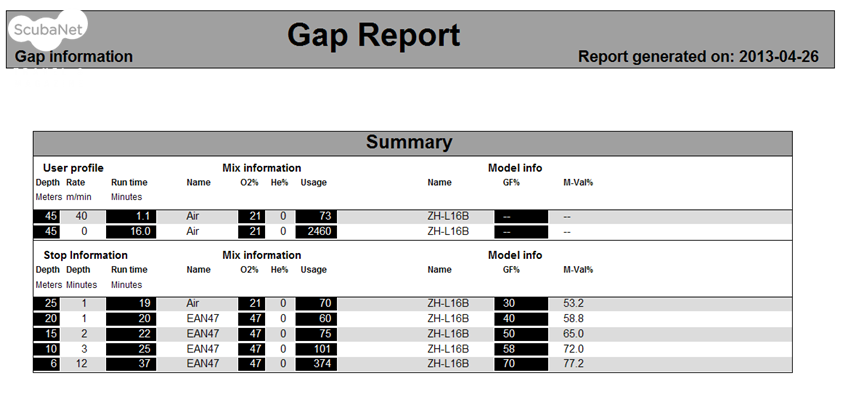 GAP software output-수심별 감압시간과 공기소모량등 계획한 다이빙의 세부 정보를 얻을 수 있다.