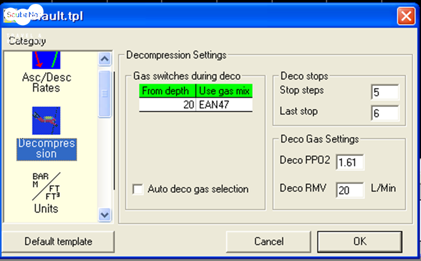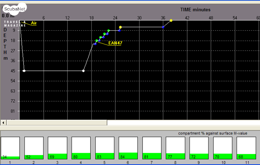 감압절차: 최대수심 45m -> ERD(익스텐디드 레인지 다이버): 최대수심 55m