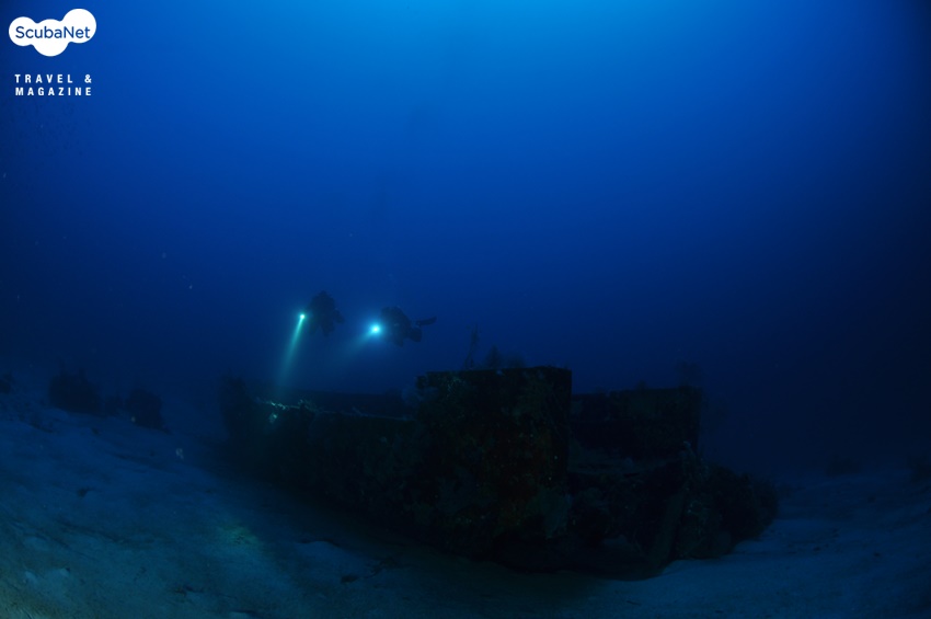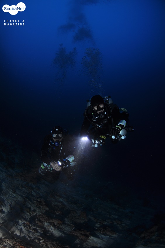 분당 40m라는 어마어마한 하강 속도 때문에 20m부터 준비하여 호흡기를 바꿔 물고 나니 벌써 40m였다. 다행히 능숙하신 분들과 함께 하니 40m에서 기체전환에 호흡기 호스 정리하고, 컴퓨터 기체 교환까지 완료할 때까지 여유롭게 기다려 주셨다. 오늘은 70m에 있는 침몰선까지 내려가보기로 하였다. 그리 크진 않았지만, 푸르스름한 어둠 아래 조용히 누워있는 배가 점점 모습을 보이기 시작하자 왠지 모를 흥분감이 온몸을 감싸 돌았다. 오후에 두 번째 다이빙은 마지막 100m 코스의 사전 답사를 하기로 하였다. 100m까지 가는데 특이한 사항은 없는지, 지형지물 및 직벽이 끝나고 슬로프가 시작되는 수심 등등을 확인 차 사전 점검을 하기 위해 들어갔다.