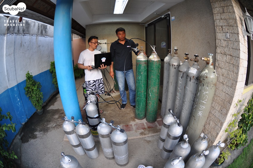 저녁식사 후에는 다음 날 다이빙할 수심을 정하고 바텀 및 감압 기체 성분을 계획하였다. 그리고 계획된 기체를 혼합하기 위한 기체량을 계산하고 계산된 기체량에 따라 충전을 시작하였다. 씨홀스의 권경혁 트레이너가 예전부터 테크니컬 다이빙을 해와서 그런지 블렌딩 시스템이 매우 훌륭히 세팅되어 있었다. 헬륨은 헬륨 별로 산소는 산소 별로 계획한 만큼 충전해서 다음 단계로 넘기기만 하면 되도록 구축되어 있어 수월하게 블렌딩 작업을 할 수 있었다. 3명이 사용하는 탱크를 12개나 충전 하다 보니 적지 않은 시간이 흘렀지만 시간이 가는 줄 모를 만큼 즐거운 작업이었다.