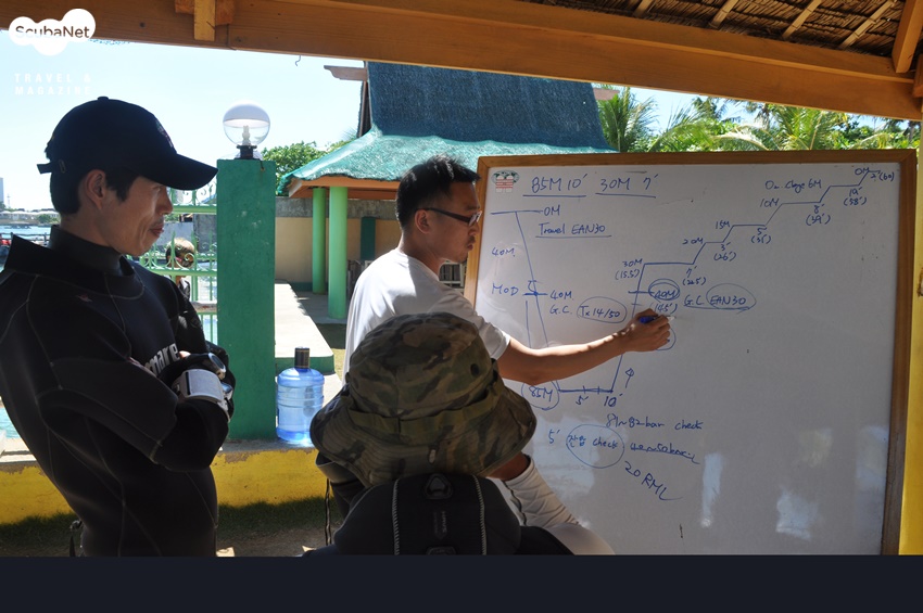 100m를 가기 위한 준비 다음 날은 100m를 가기 전 마지막 점검을 위하여 85m 다이빙을 진행 하였다. 가장 먼저 기체 성분 및 압력을 확인하고, 전날 세운 계획과 실제 기체 성분 확인 후 계획을 다시 한번 체크하고, 계획된 계획에 대한 브리핑을 하였다. 이날 브리핑은 이번 과정에 다이버로 참가하게 된 필자가 진행하게 되었다. 테크니컬 다이빙에서는 구성원의 그 어느 누구도 리더가 될 수 있어야 한다. 그렇기 때문에 개개인이 감압과정에 대한 이해를 확실히 하고 그에 따라 세운 계획을 혼자서도 따르며 진행할 수 있어야 한다. 이러한 훈련을 하는 것은 만에 하나라도 그룹과 떨어지는 경우를 대비하고, 또한 리더가 더 이상 다이빙 리딩이 어려울 경우 팀원 중 어느 누구도 리더의 역할을 대신할 수 있게 하기 위함이다.