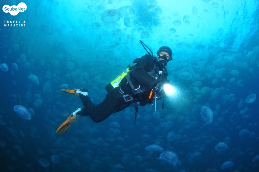보트에 함께 타고 있던 다이버들도 배 위에서 해파리 떼를 보며 감탄을 연발했다. 다이빙 보트를 운전하던 박상용 대표에게 좌표를 찍어 놓으라고 했다. 해파리 떼는 폭 20m에 길이 80m 정도로 큰 띠를 이루고 있었기에 배 위에서도 뚜렷하게 보였다. 다시 찾아올 생각으로 서둘러 리조트로 복귀하는데도 해파리 군락이 머리 속에서 떠나지 않았다.