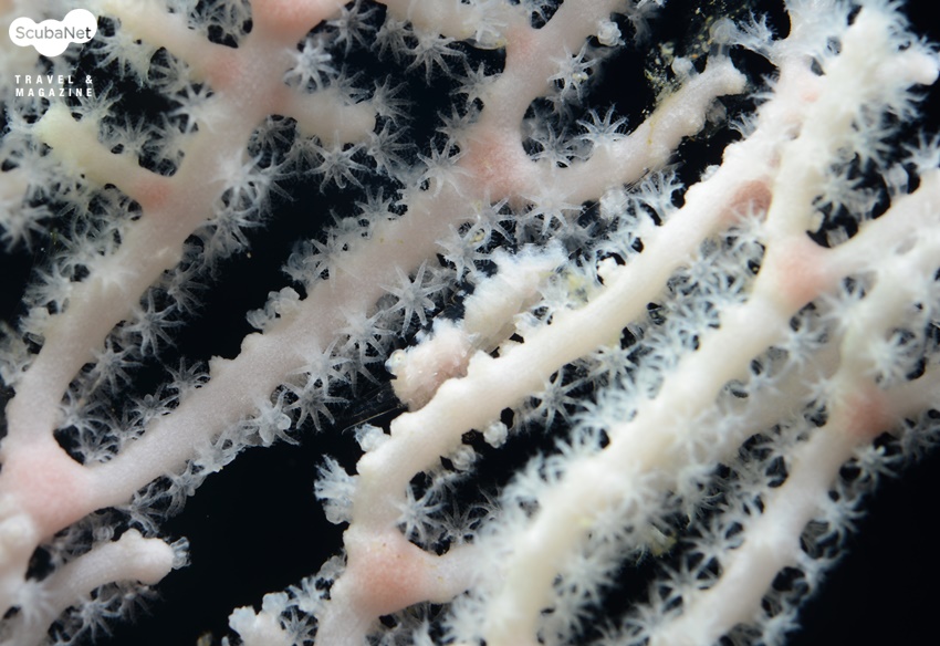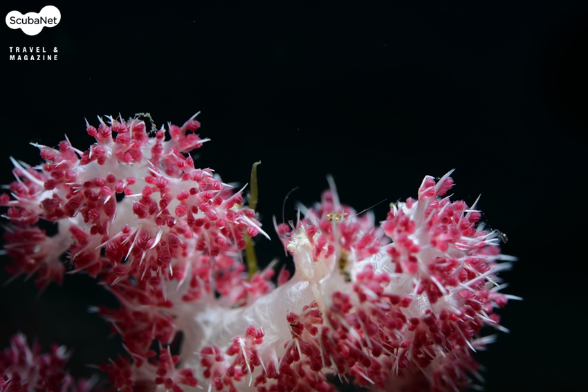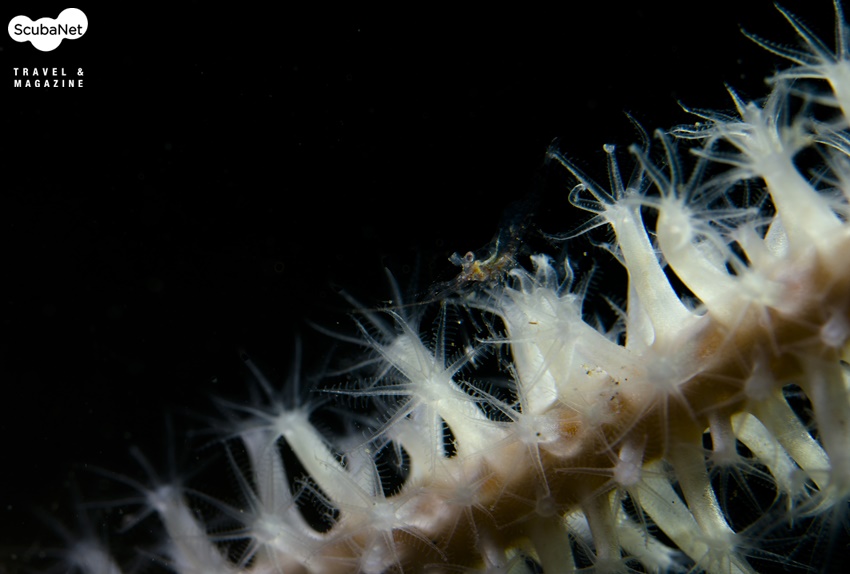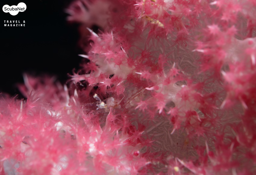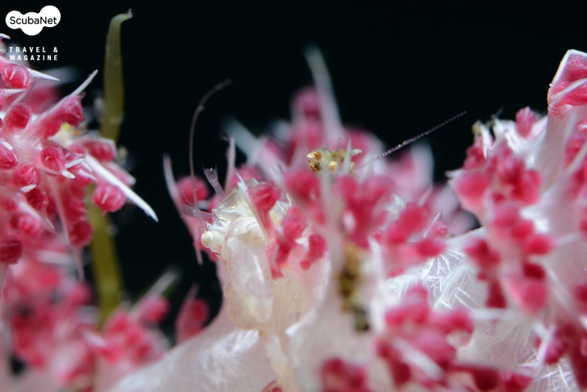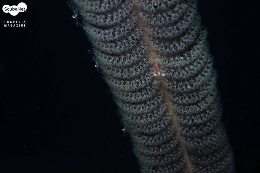 연산호 안에 공생하는 투명 새우인데 연산호 폴립 속 깊은 곳에 숨어있는 새우와 폴립의 어울림 그대로의 상태를 촬영하였다.
