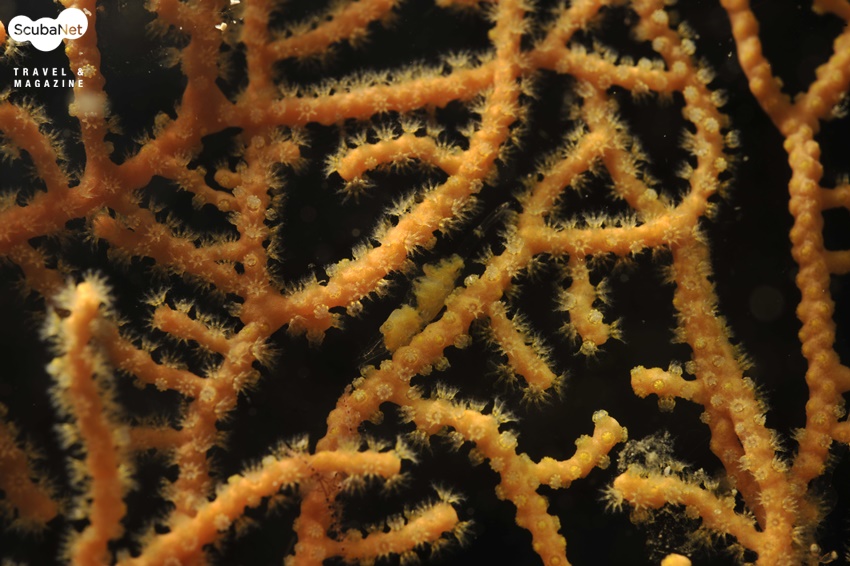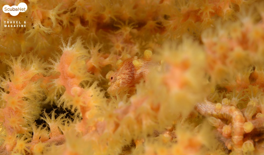 골고니안 산호에 있는 피그미해마. 항상 산호의 폴립이 피어있는 것은 아니지만 대부분 강한 조류에서 폴립이 피는 것 같다. 하지만 폴립이 피어있으면 위 사진처럼 피그미 해마를 가리게 되는데 폴립과 해마의 어울림을 표현한다면 좋은 사진을 만들 수 있을 것이다.