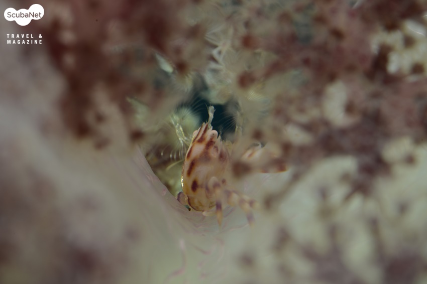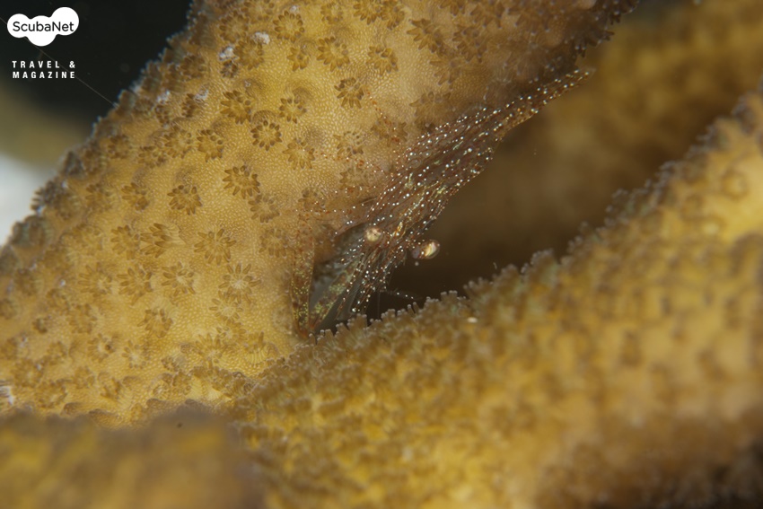 보호색과 보호무늬로 은폐를 아주 잘 하고 있는 경산호 공생새우이다. 이런 종류의 공생새우는 촬영하기 쉬운 앵글이 나오기 까지 기다리지 않고 피사체에 조금이라도 자극을 시키면 그 다음은 움직임이 많아져 촬영이 더 어려워진다.