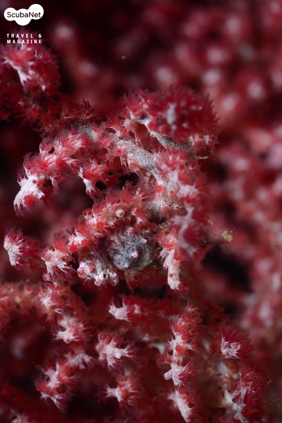 연산호 공생게인데 연산호와 비슷한 무늬를 띄고 있어서 잘 눈에 띄지 않는다. 눈에 띄고 촬영하기 좋은 곳으로 유도하기 보다는 고배율로 촬영하던지 아니면 촬영 후 크롭 확대하는 것이 자연스러운 미를 더해줄 수 있을 것이다.