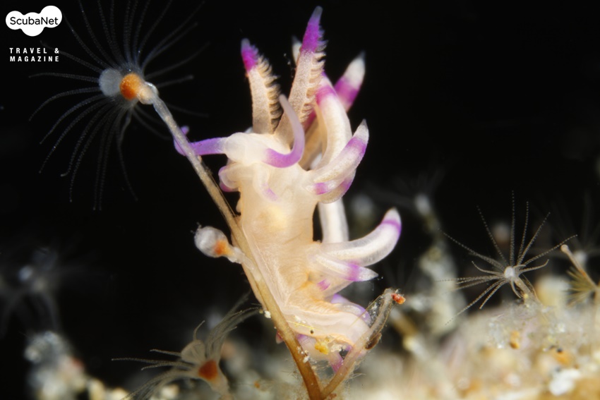 아주 미세한 구조의 히드라에 붙어있는 갯민숭 달팽이. 이것 역시 약간의 건드림으로도 전체의 프레임이 흐트러질 수 있을 것이다.