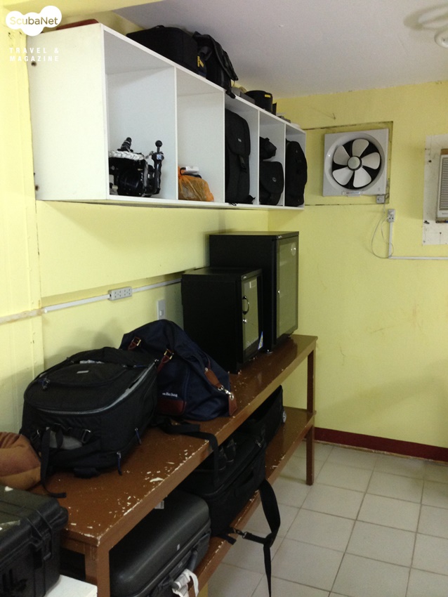특기할 만한 점은 수중사진가에게 최고의 숍이라는 명성에 걸맞게 카메라 룸이 매우 잘 갖춰져 있었다. 도서실처럼 각 칸마다 각자의 카메라를 세팅할 수 있는 공간이 책상으로 마련되어 있고, 배터리충전도 용이하게끔 전원코드도 각 테이블마다 준비되어 있었다. 제일 좋았던 점은 습기에 자주 노출될 수 밖에 없는 카메라와 렌즈를 건조시킬 수 있는 건조기가 준비되어있다는 점이었다. 암과 렌즈 등을 하우징에 세팅하면서 이렇게 편하게 한 적이 있었나 하는 생각이 들었다. 카메라 룸은 또한 자동 키패드로 시건장치가 되어있어 저녁에는 자동으로 문을 닫으면 잠기게 되어있어 마음 편히 카메라를 놓고 숙소로 돌아올 수 있었다.