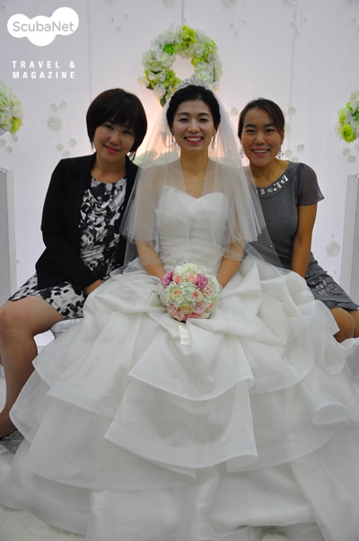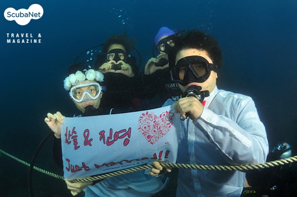 그리고 드디어 체험다이빙을 하는 날. 새신랑 한슬이와 새신부 진영이는 한껏 들뜬 모습으로 아라다이브에 나타났다. 먼저 동방파제에서 체험다이빙을 하면서 다이빙이 어떤 것인지 적응하는 시간을 갖게 했다. 그리고 마스크와 슈트 위에 준비한 의상을 입고 강사님들의 손에 들.려. 물 속으로 이동! 주인공 둘은 동방파제에 설치되어 있는 밧줄을 잡게 했고 옆에서는 강사님들이 롱호스를 준비한 채 주인공 둘을 잡고 계셨다. 걱정과 달리 둘 다 무척 즐거워하며 물 속에 적응을 잘 했고 자연스레 포즈를 취해줬다.